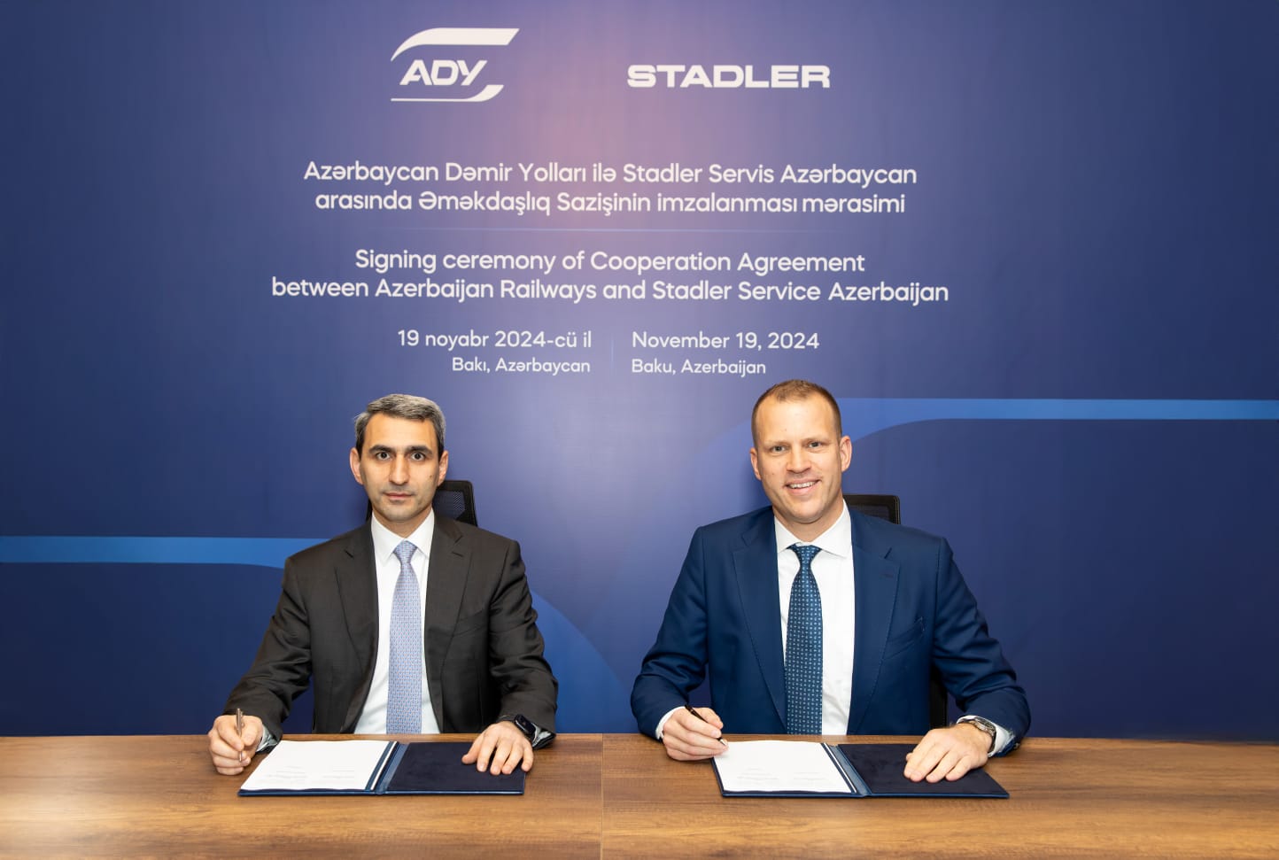 “Azərbaycan Dəmir Yolları” QSC-nin (ADY) sədri Rövşən Rüstəmov və İsveçrənin “Stadler Rail Group” şirkətinin icraçı vitse-prezidenti Daniel Baer Bakı şəhərində Təlim və İnkişaf Mərkəzinin yaradılmasına dair müqavilə imzalayıblar.