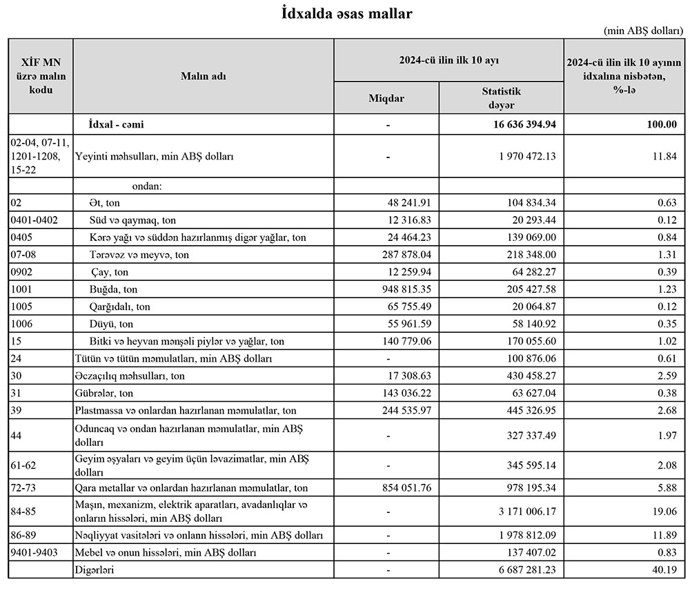 2024-cü ilin yanvar-oktyabr dövründə Azərbaycanın ən çox ixrac və idxal etdiyi mallar.