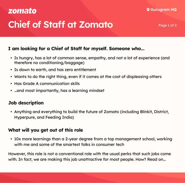 Hindistanın çatdırılma tətbiqi Zomato-nun Baş direktoru, ilk il maaş ödənilməyəcək və işə qəbul edilən namizədin Zomato-ya 23 min dollar ödəyəcəyi Personel şefi axtardığını bildirən bir elan dərc edib.Hindistanının çatdırılma tətbiqi Zomato-nun baş direktoru Deepinder Goyal sosial mediada Personel şefi (Chief of staff) axtardığını elan edib.