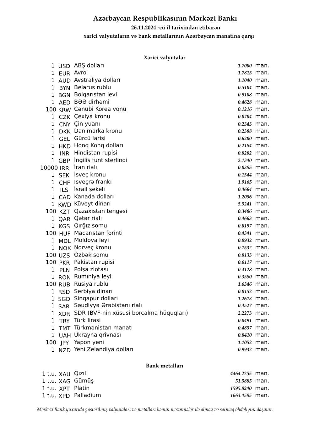 Dolların bazar ertəsi üçün rəsmi məzənnəsi müəyyən olunub