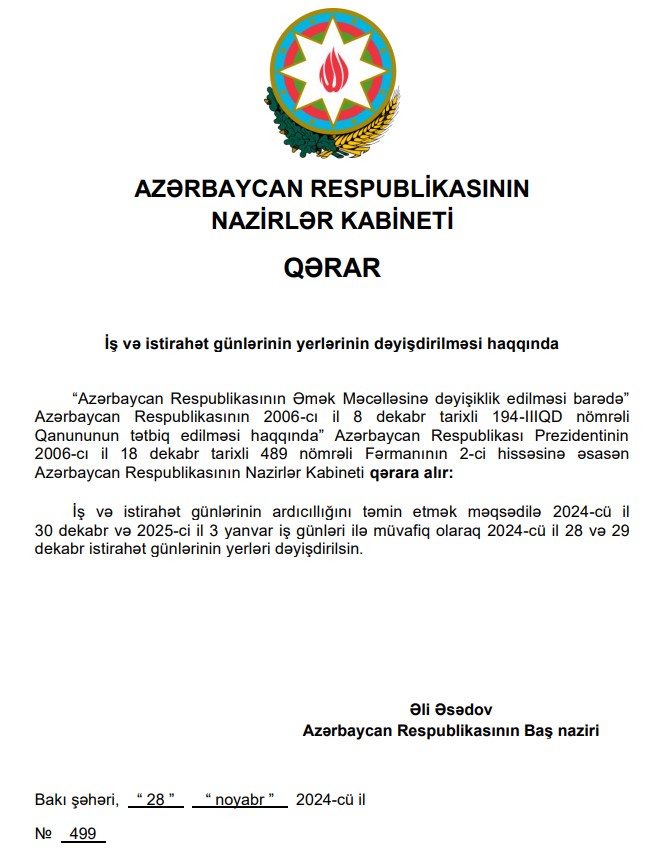 Qərara əsasən, iş və istirahət günlərinin ardıcıllığını təmin etmək məqsədilə 2024-cü il 30 dekabr və 2025-ci il 3 yanvar iş günləri ilə müvafiq olaraq 2024-cü il 28 və 29 dekabr istirahət günlərinin yerləri dəyişdirilib.