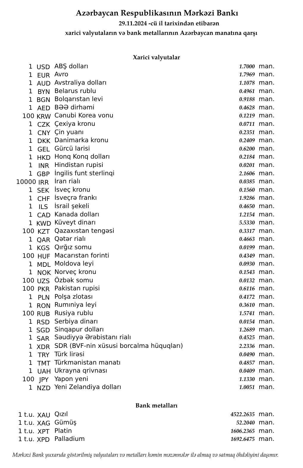 Dolların bazar ertəsi üçün rəsmi məzənnəsi müəyyən olunub