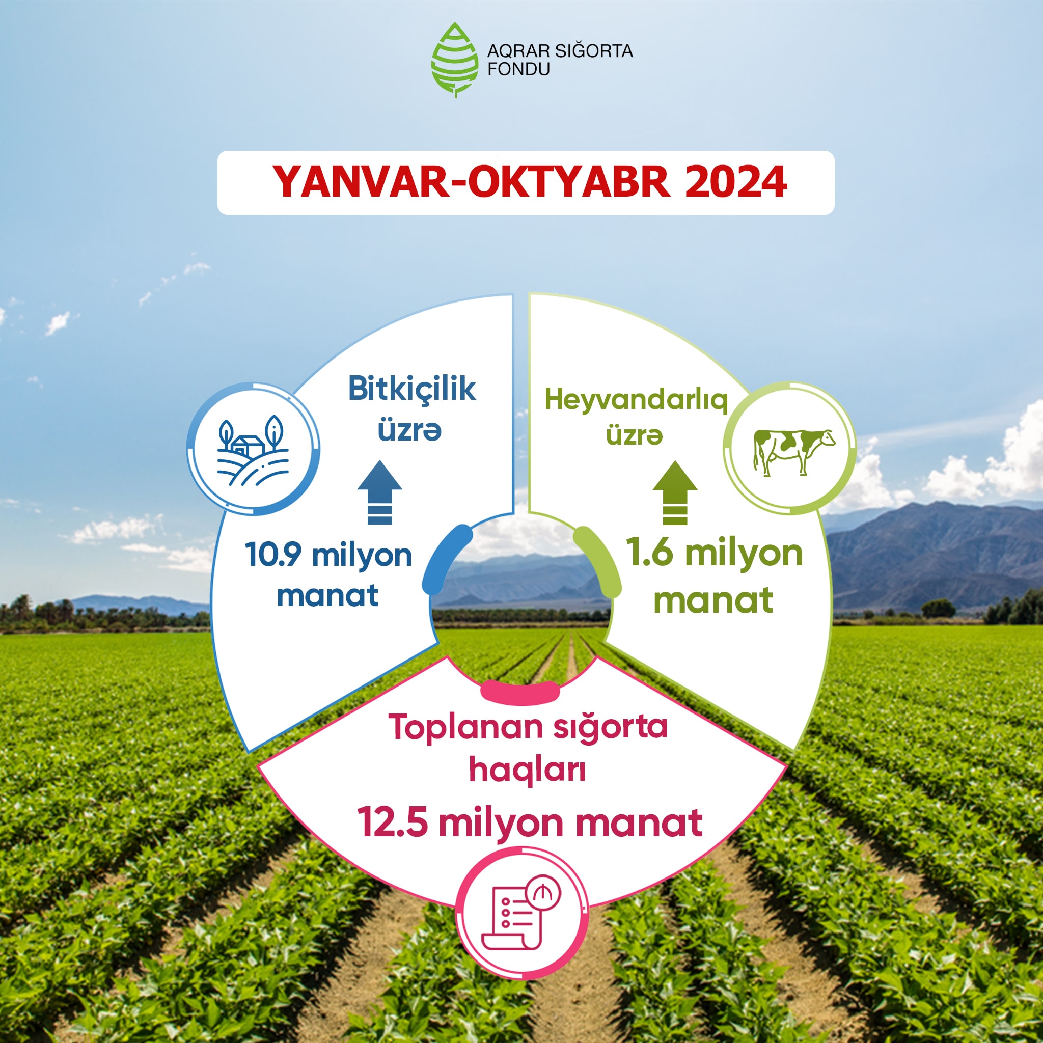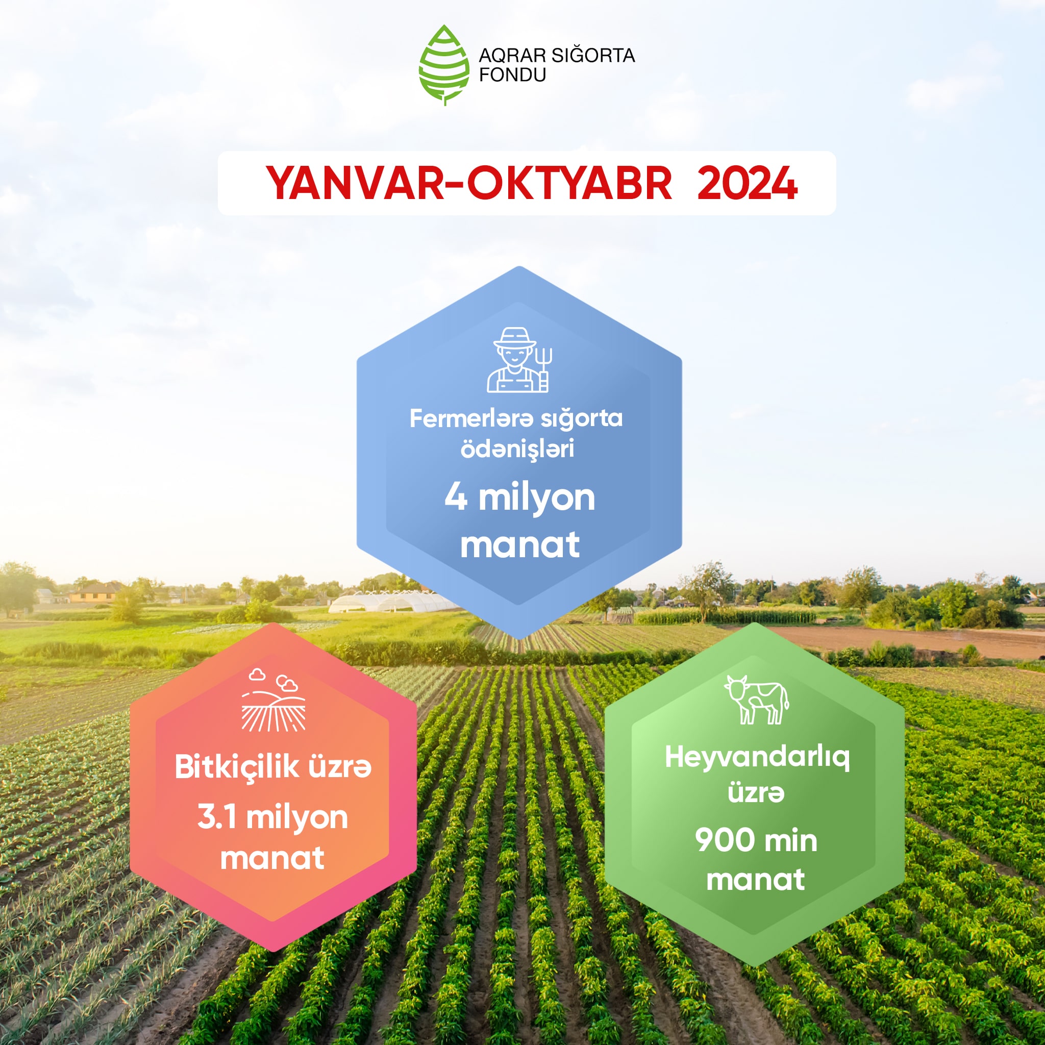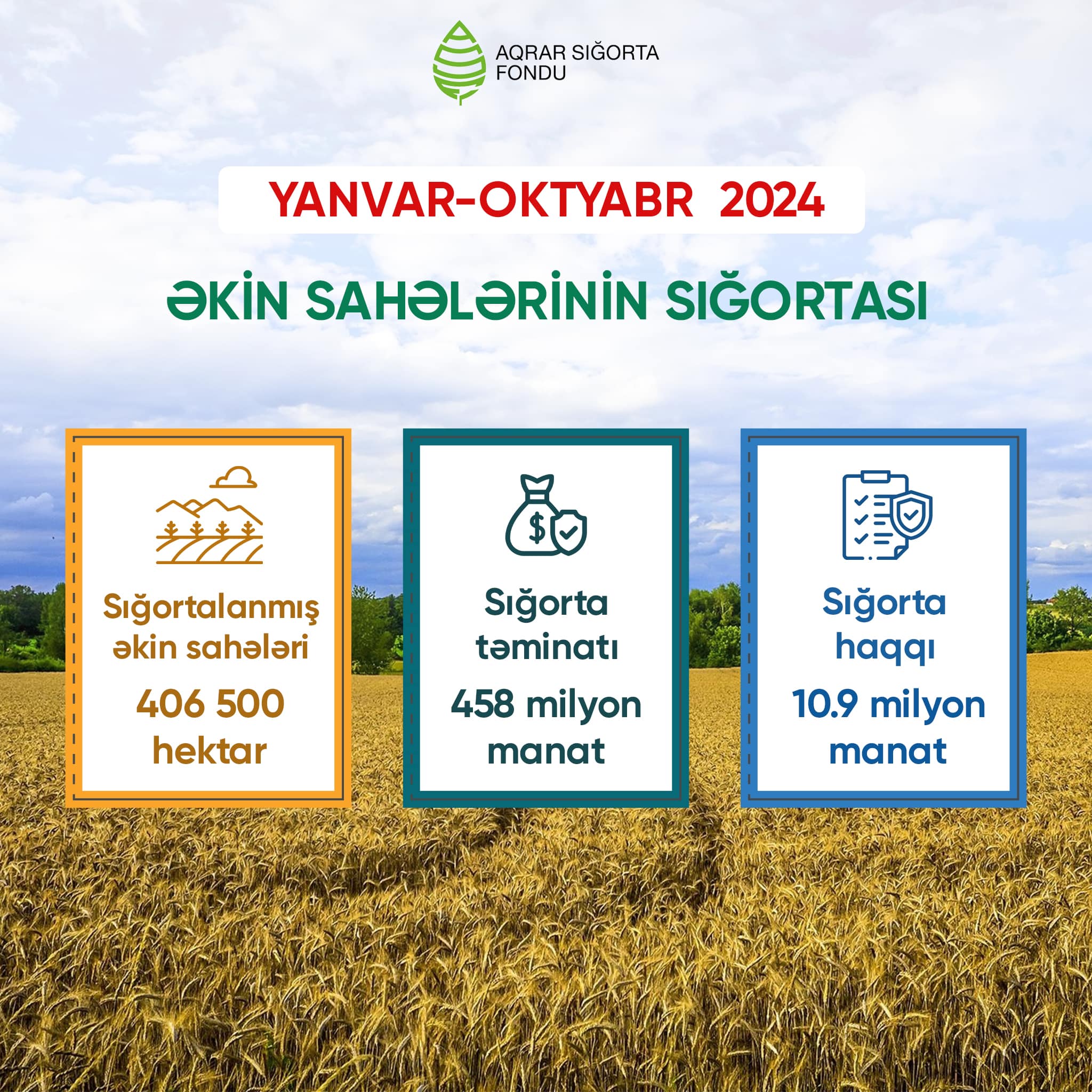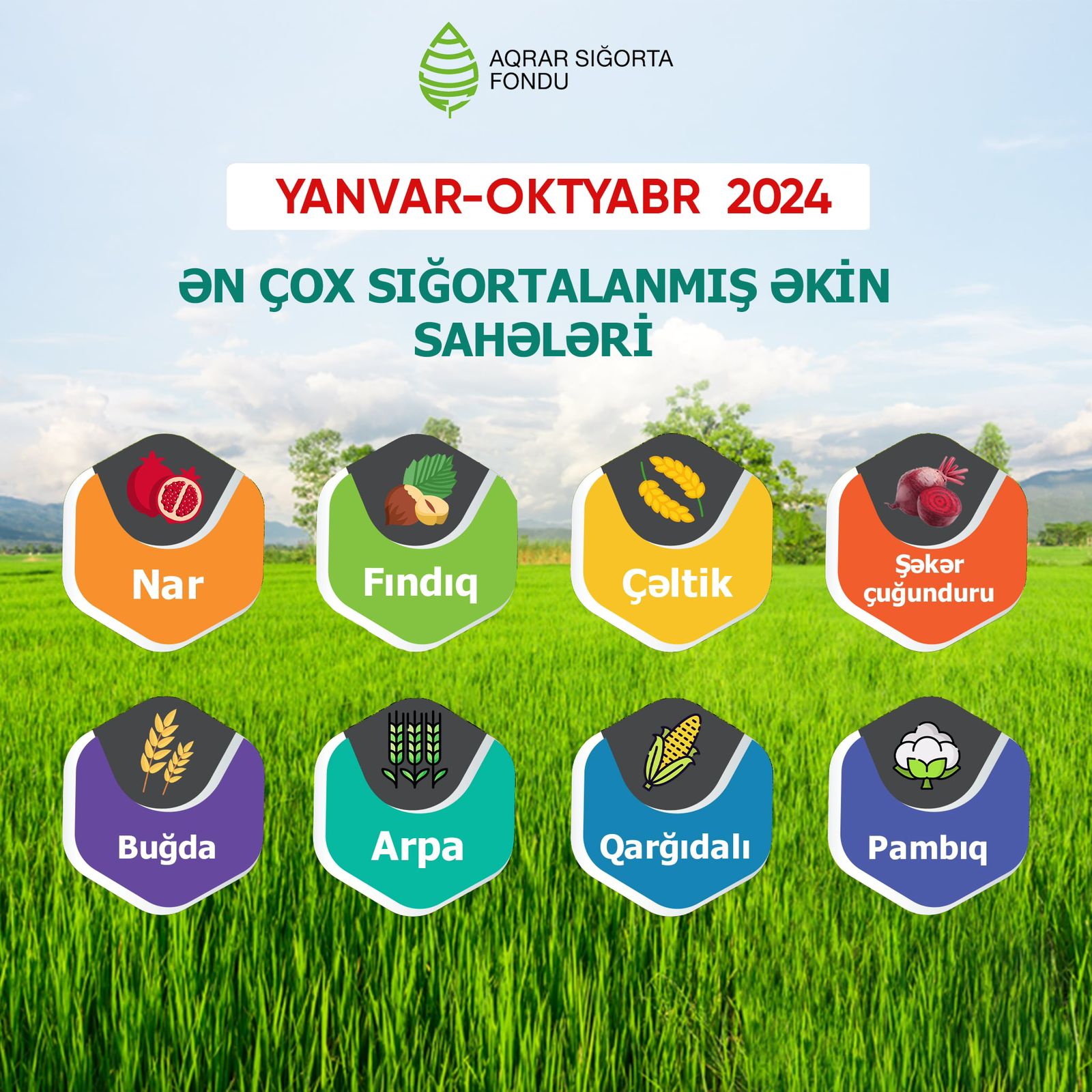 2024-cü ilin ilk 10 ayında ölkə üzrə 406 500 hektar əkin sahəsi sığortalanıb və 10 milyon 841 min manat sığorta haqqı toplanıb. Ən çox sığortalanan bitkilər nar, fındıq bağları, çəltik, şəkər çuğunduru, buğda, arpa, qoarğıdalı, pambıq sahələridir.