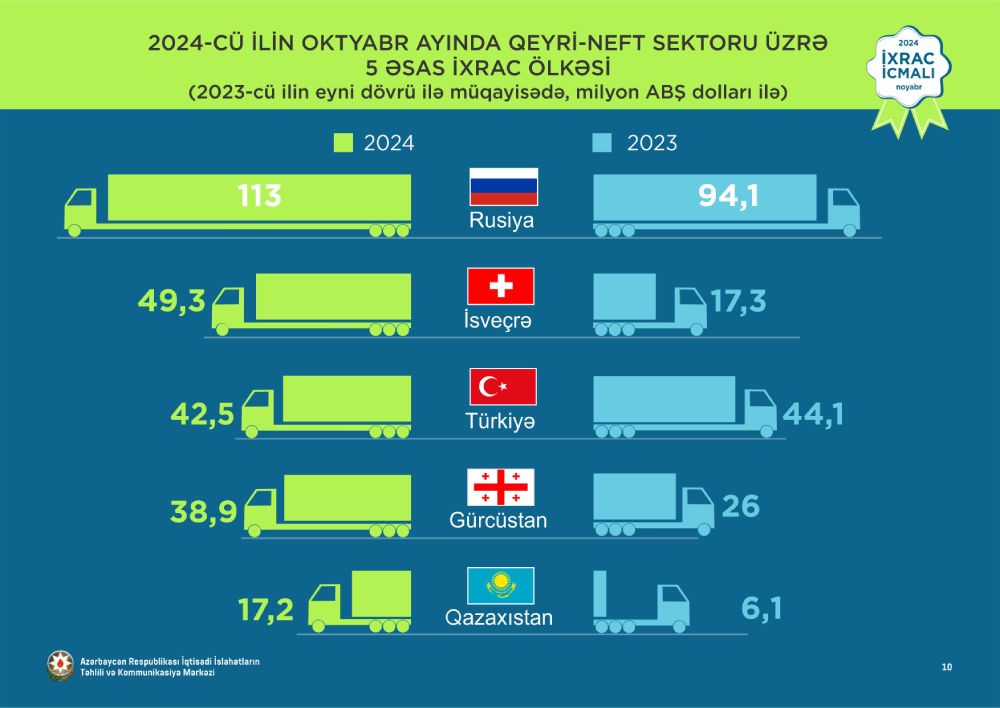 2024-cü ilin oktyabr ayında qeyri-neft sektoruna aid ən çox mal ixrac edilən ölkələrin siyahısında Rusiya Federasiyası (113 milyon ABŞ dolları) birinciliyə yüksəlib. Bu siyahıda İsveçrə (49.3 milyon ABŞ dolları) ikinci və Türkiyə (42.5 milyon ABŞ dolları) üçüncü olub.