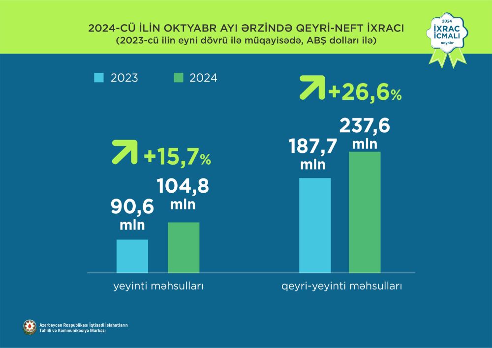 İqtisadi İslahatların Təhlili və Kommunikasiya Mərkəzinin (İİTKM) təqdim etdiyi “İxrac İcmalı”na əsasən, 2024-cü ilin yanvar-oktyabr ayları ərzində Azərbaycanın qeyri-neft-qaz ixracı 2023-ci ilin müvafiq dövrü ilə müqayisədə 3,5% artaraq 2,8 milyard ABŞ dolları təşkil edib. 2024-cü ilin yanvar-oktyabr ayları ərzində yeyinti məhsullarının ixracı 13,6% artaraq 803,1 milyon ABŞ dollarına bərabər olub.