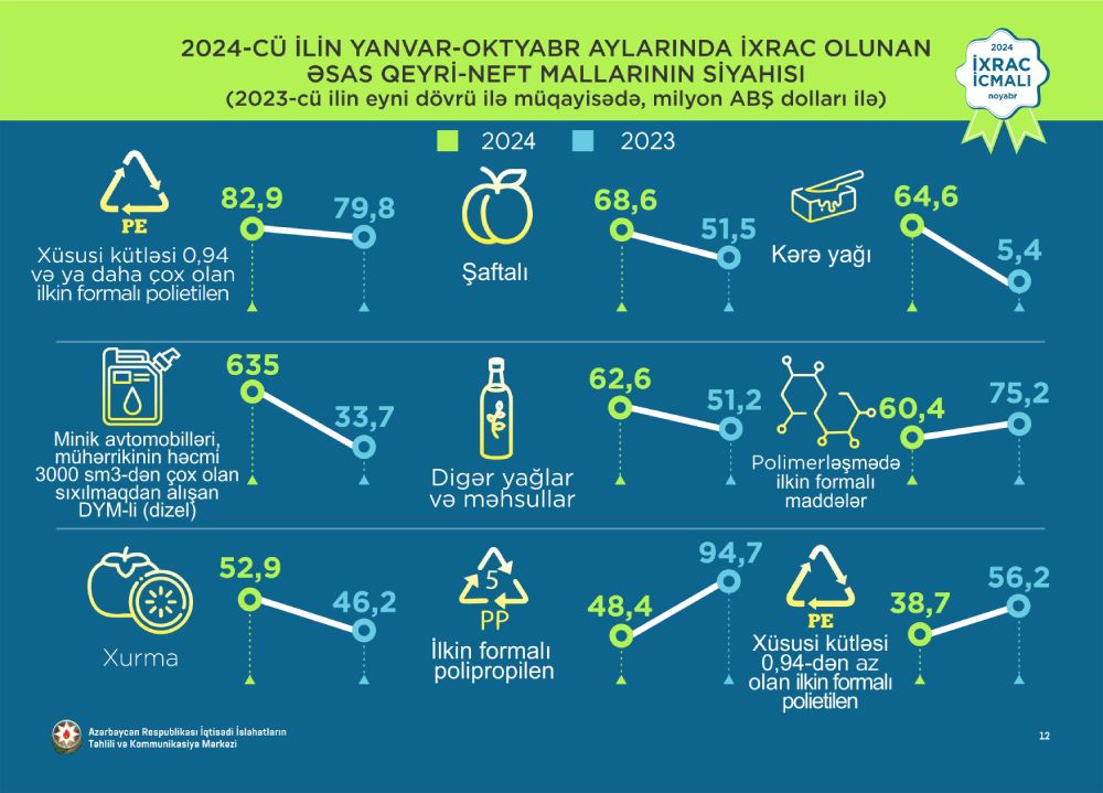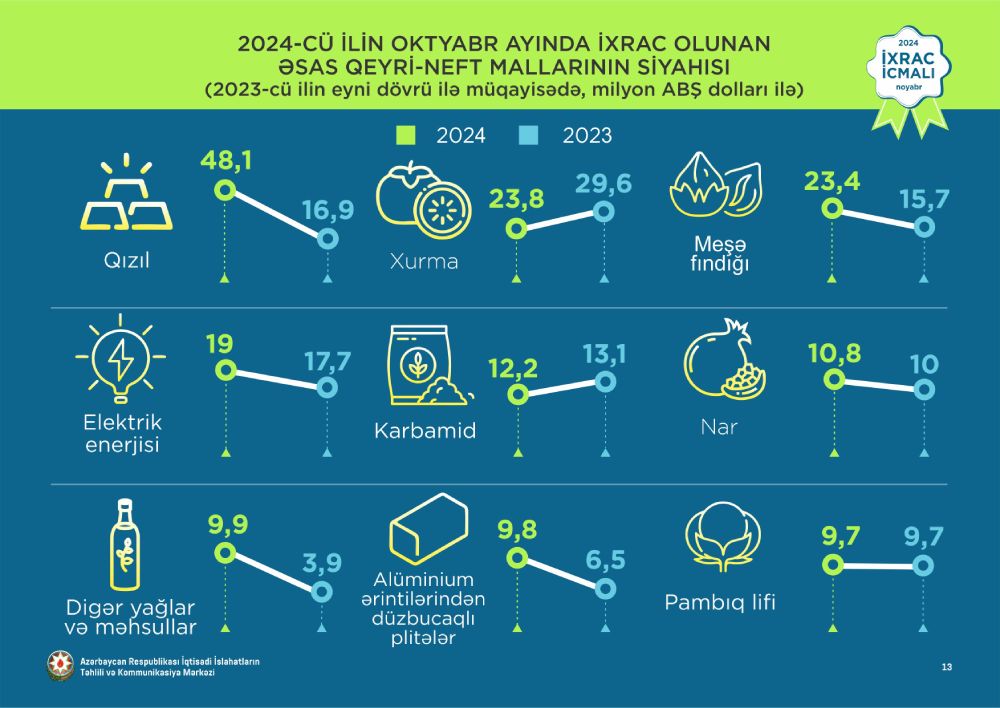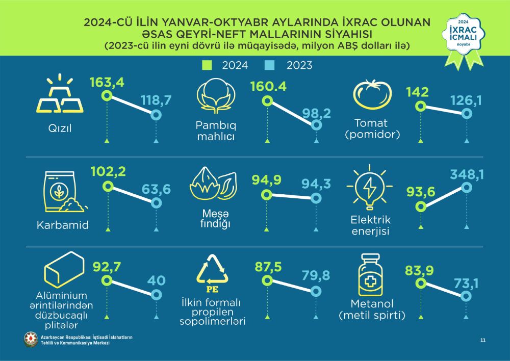 2024-cü ilin yanvar-oktyabr ərzində ixrac edilmiş qeyri-neft sektoruna aid malların siyahısında qızıl (163.4 milyon ABŞ dolları) birinci olub. Bu siyahıda pambıq mahlıcı (160,4 milyon ABŞ dolları) ikinci, tomat (pomidor) (142 milyon ABŞ dolları) isə üçüncü yerdə qərarlaşıb.