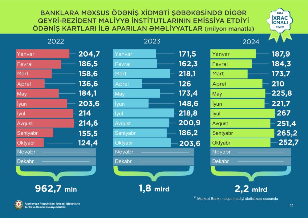 2024-cü ilin yanvar-oktyabr aylarında banklara məxsus ödəniş xidməti şəbəkəsində digər qeyri-rezident maliyyə institutlarının emissiya etdiyi ödəniş kartları ilə 2.1 milyard manat, yalnız oktyabr ayında isə 252.7 milyon manat dəyərində əməliyyat aparılıb.