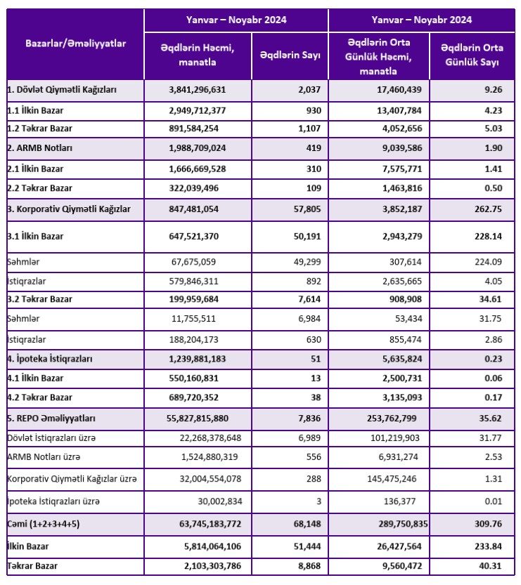 Azərbaycan Respublikası Maliyyə Nazirliyi 2024-cü ilin 11 ayı ərzində (yanvar-noyabr) dövlət istiqrazlarının yerləşdirilməsi yolu ilə 2 milyard 949 milyon 712 min manat borclanıb.