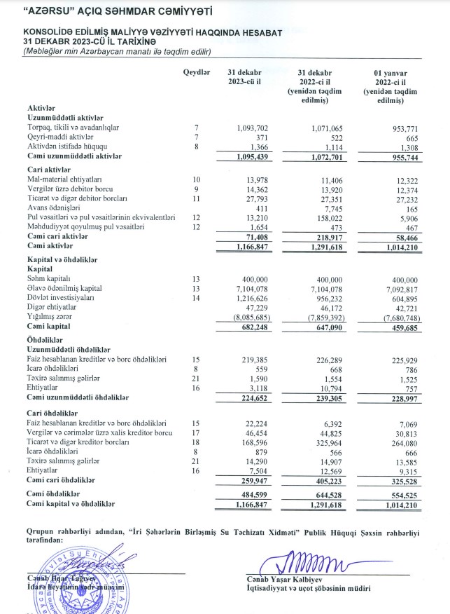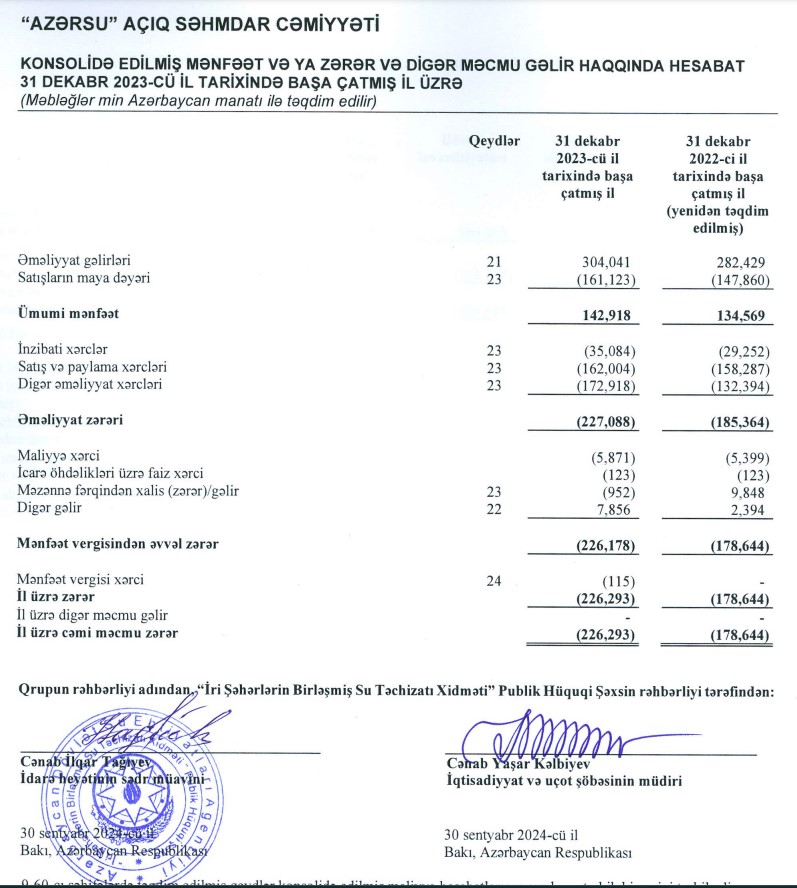 İri Şəhərlərin Birləşmiş Su Təchizatı Xidmətinin zərəri 27 %-ə yaxın artıb.İri Şəhərlərin Birləşmiş Su Təchizatı Xidməti Pablik Hüquqi Şəxs (keçmiş "Azərsu") 2023-cü ili 226 milyon 293 min manat xalis zərər ilə başa vurub. Xidmət 2022-ci ili 178 milyon 644 min manat xalis zərər ilə bağlamışdı. Beləliklə, ötən il İri Şəhərlərin Birləşmiş Su Təchizatı Xidmətinin xalis zərəri 47 milyon 649 min manat və ya 26,7% artıb.