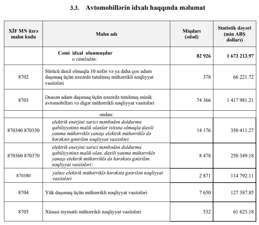 Müqayisə üçün qeyd edək ki, 2023-cü ilin 11 ayı ərzində Azərbaycana 1 milyard 522 milyon 374 min dollar dəyərində 88 min 738 ədəd nəqliyyat vasitəsi idxal olunmuşdu.