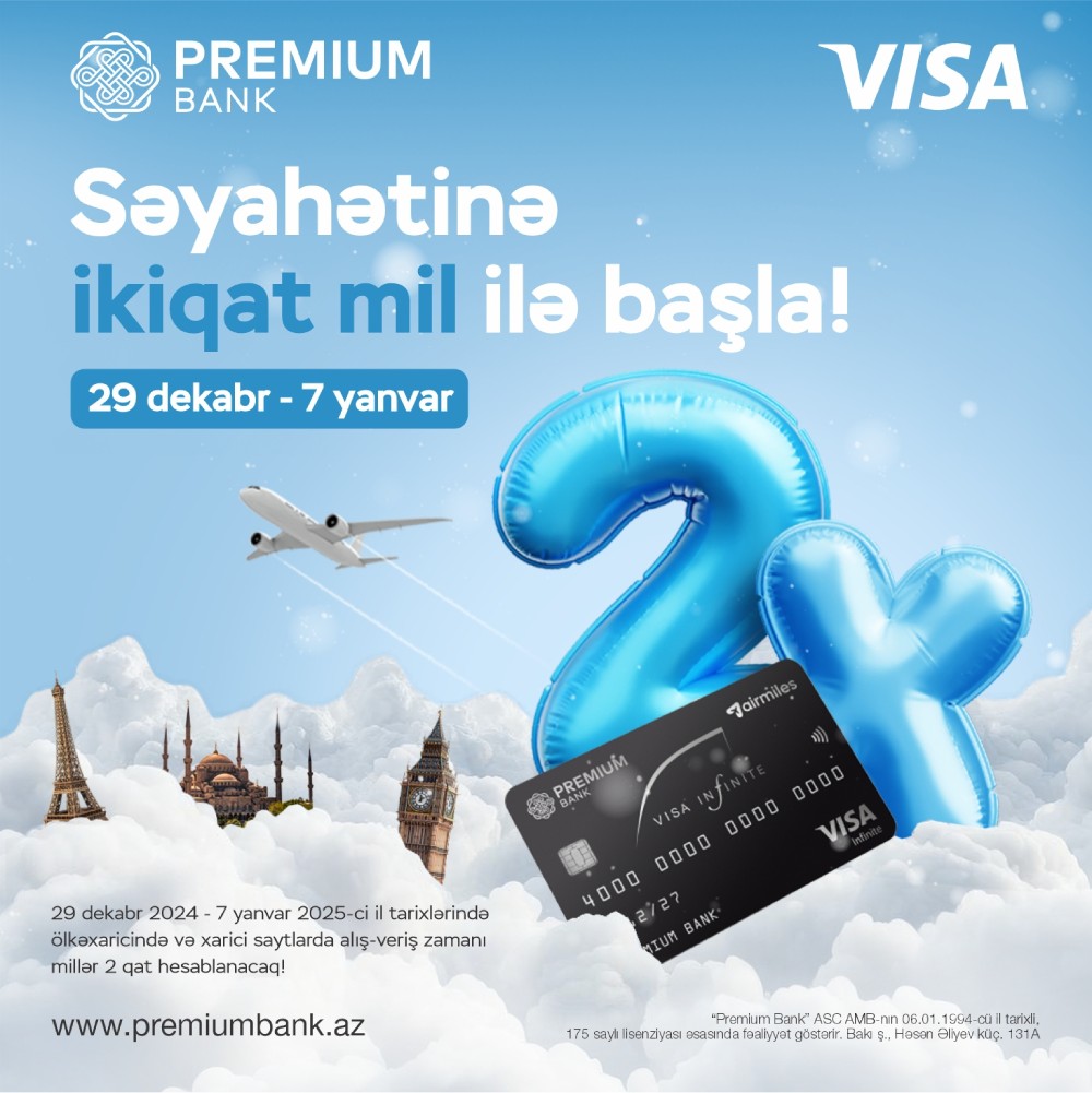 (®) 29 dekabr 2024 – 7 yanvar 2025-ci il tarixlərində Visa Airmiles kartınızla ölkəxarici ödənişlər edin, 2 qat millər qazanın!