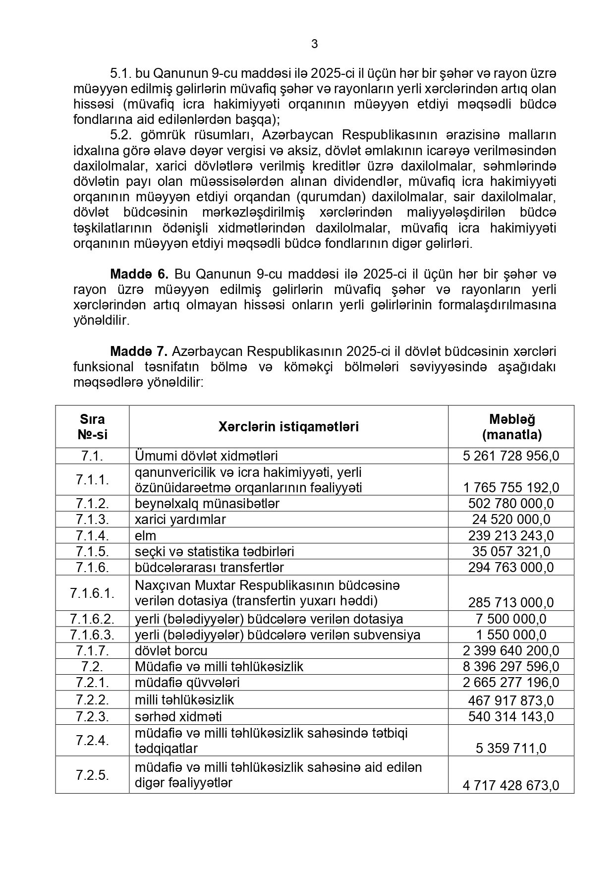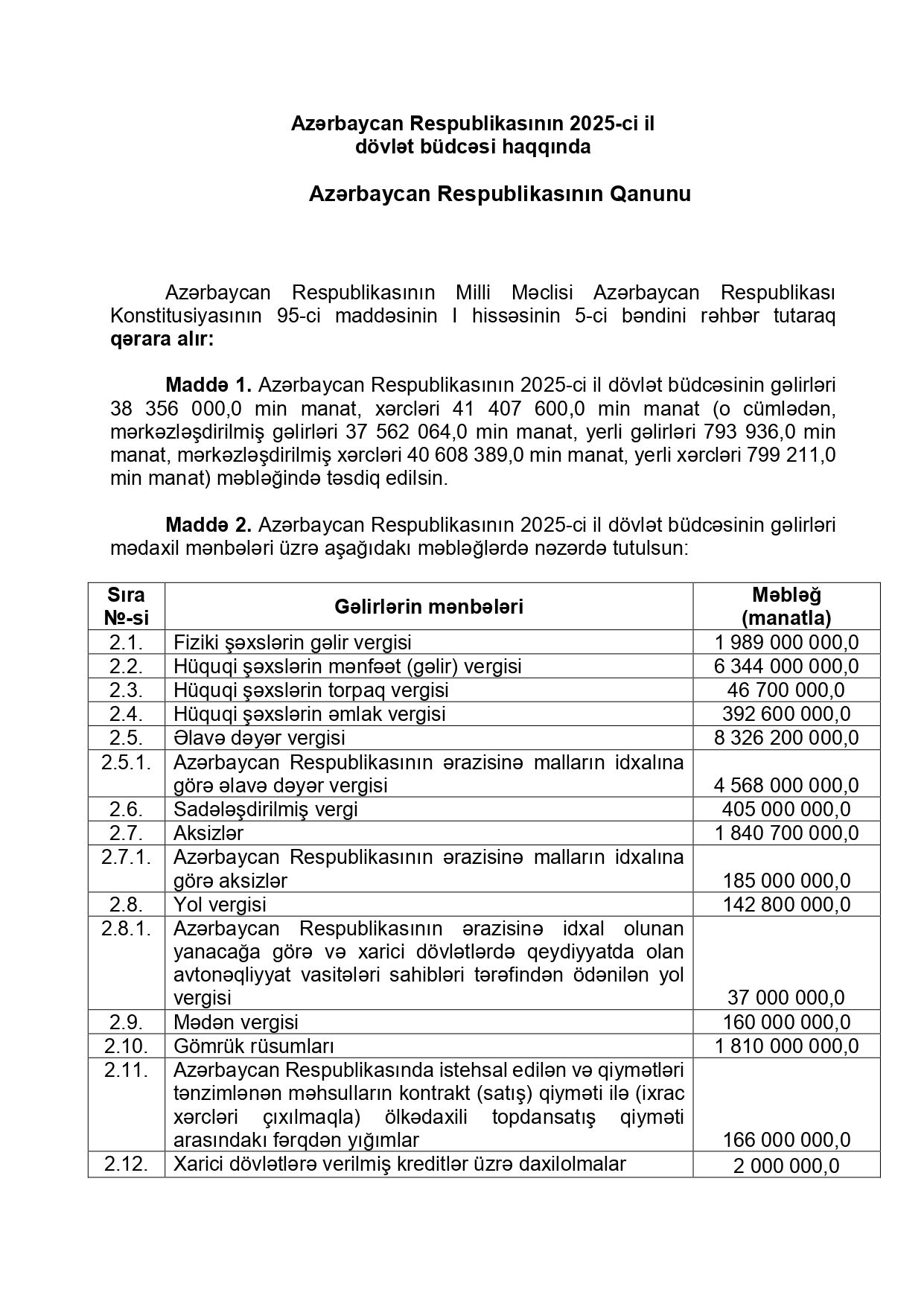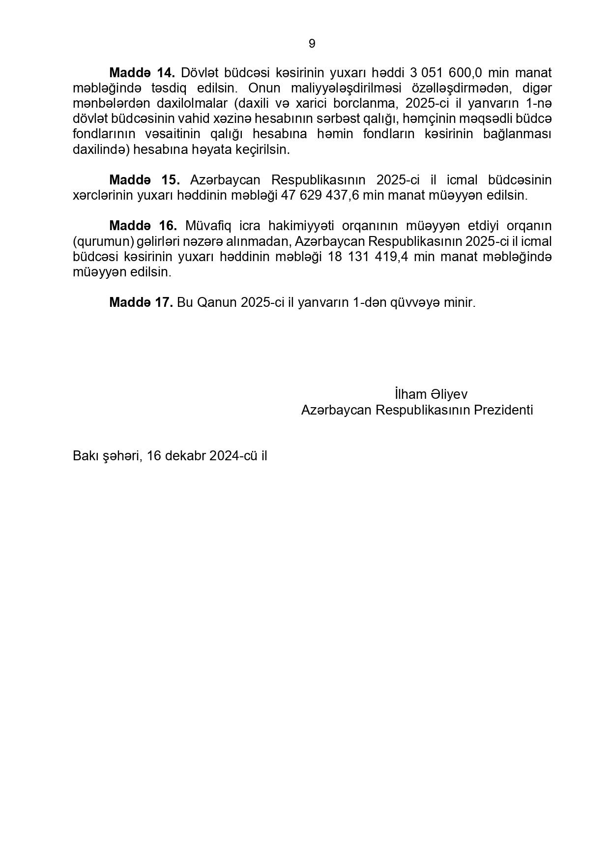 Azərbaycan Respublikasının 2025-ci il dövlət büdcəsinin gəlirləri 38 milyard 356 milyon manat, xərcləri 41 milyard 407 milyon 600 min manat (o cümlədən, mərkəzləşdirilmiş gəlirləri 37 milyard 562 milyon 64 min manat, yerli gəlirləri 793 milyon 936 min manat, mərkəzləşdirilmiş xərcləri 40 milyard 608 milyon 389 min manat, yerli xərcləri 799 milyon 211 min manat) məbləğində təsdiq edildi.Prezident İlham Əliyev Milli Məclisin dekabrın 16-da qəbul etdiyi "2025-ci il dövlət büdcəsi haqqında" qanunu təsdiqləyib.