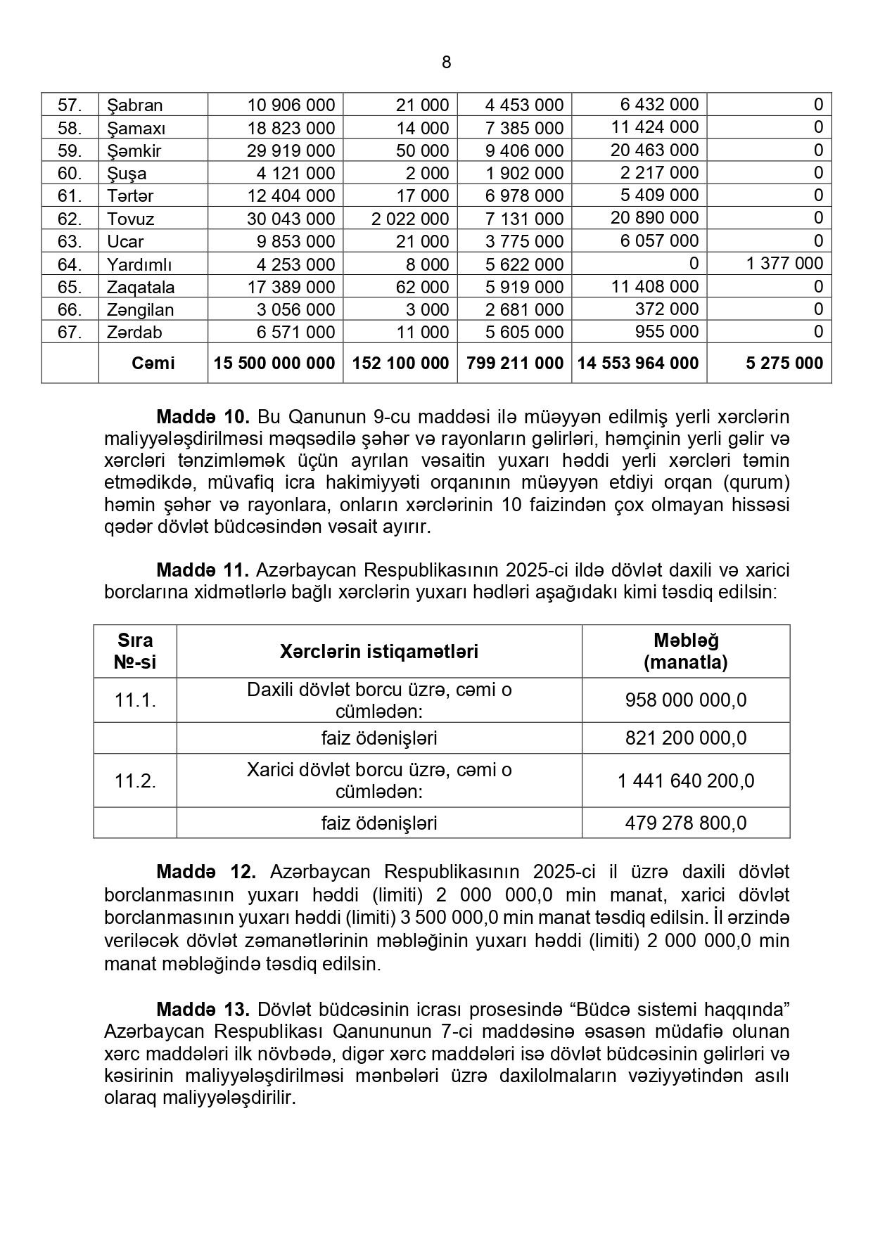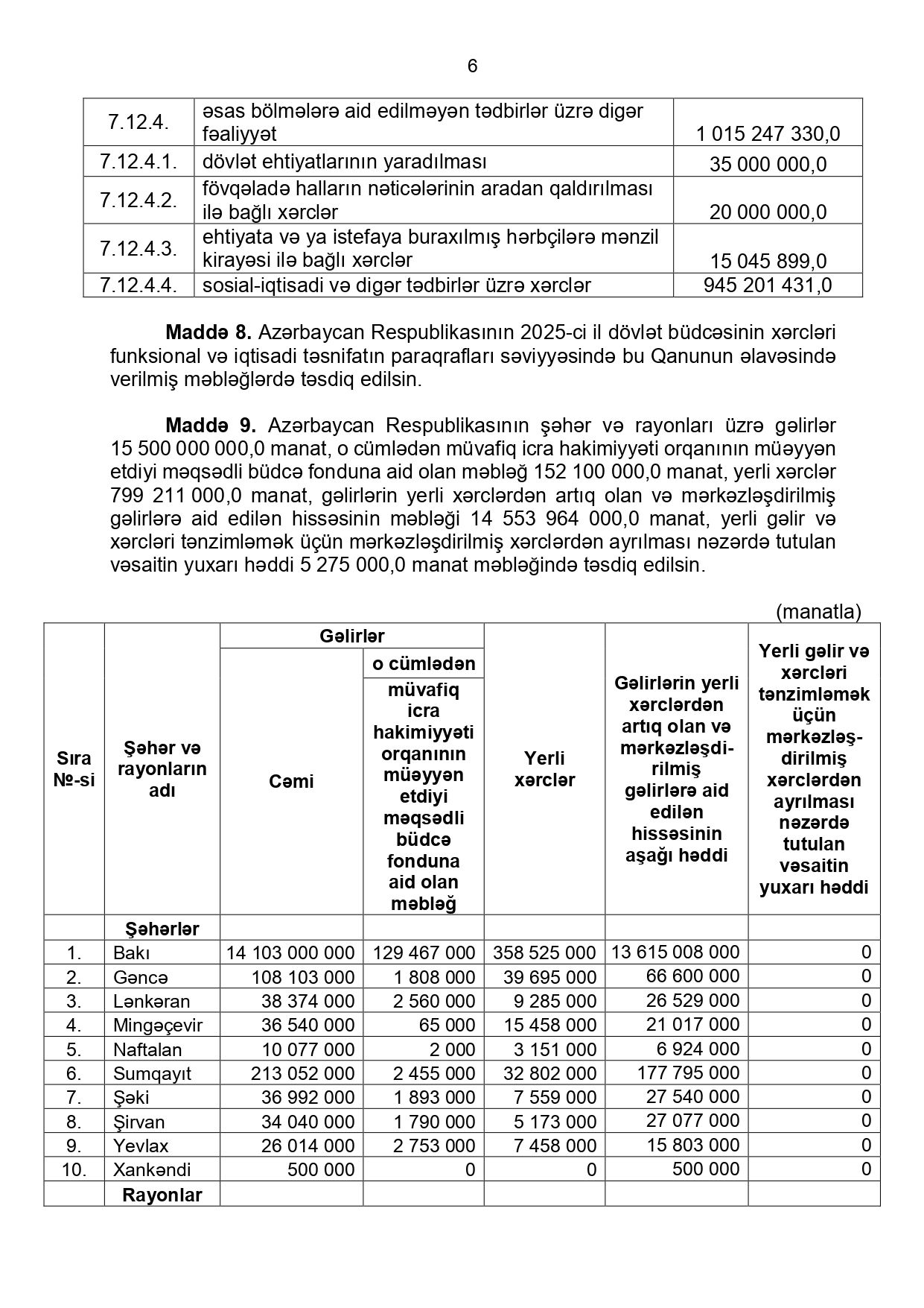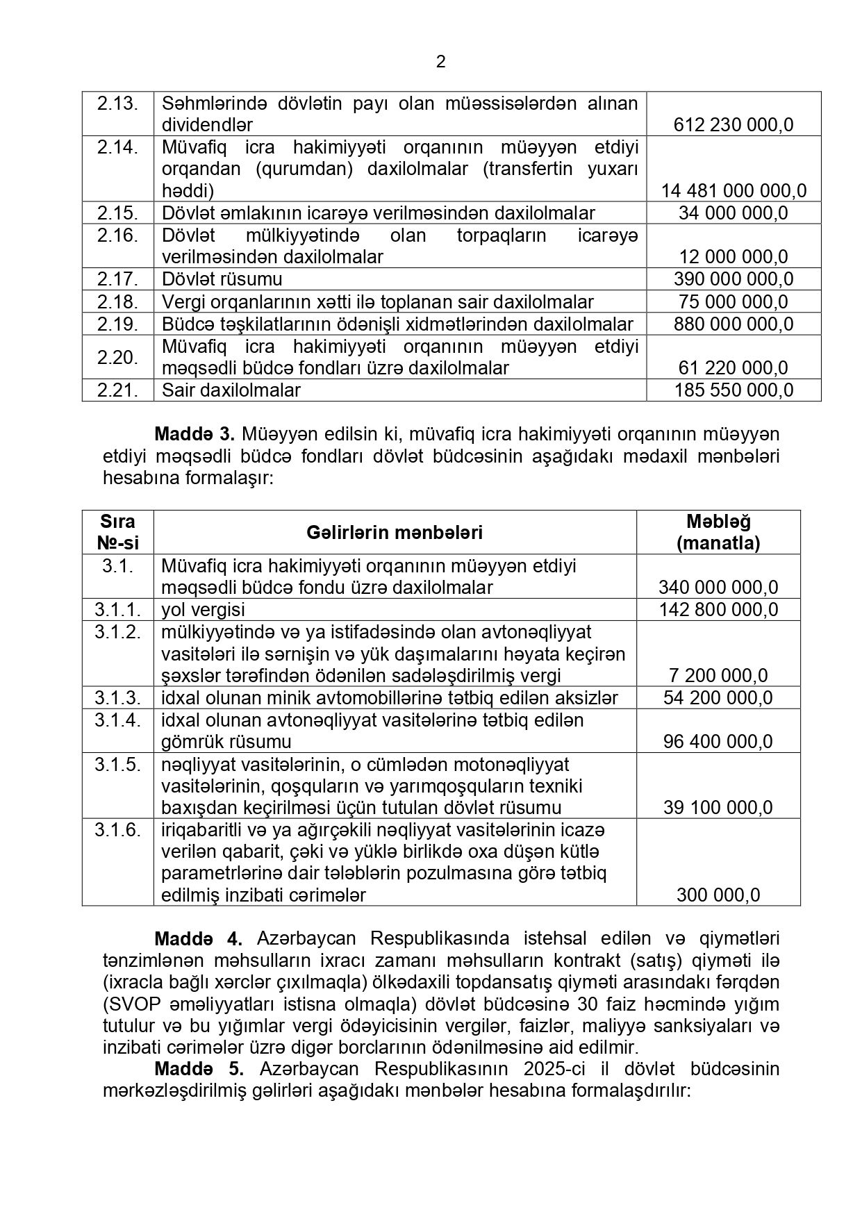 Azərbaycan Respublikasının 2025-ci il dövlət büdcəsinin gəlirləri 38 milyard 356 milyon manat, xərcləri 41 milyard 407 milyon 600 min manat (o cümlədən, mərkəzləşdirilmiş gəlirləri 37 milyard 562 milyon 64 min manat, yerli gəlirləri 793 milyon 936 min manat, mərkəzləşdirilmiş xərcləri 40 milyard 608 milyon 389 min manat, yerli xərcləri 799 milyon 211 min manat) məbləğində təsdiq edildi.Prezident İlham Əliyev Milli Məclisin dekabrın 16-da qəbul etdiyi "2025-ci il dövlət büdcəsi haqqında" qanunu təsdiqləyib.