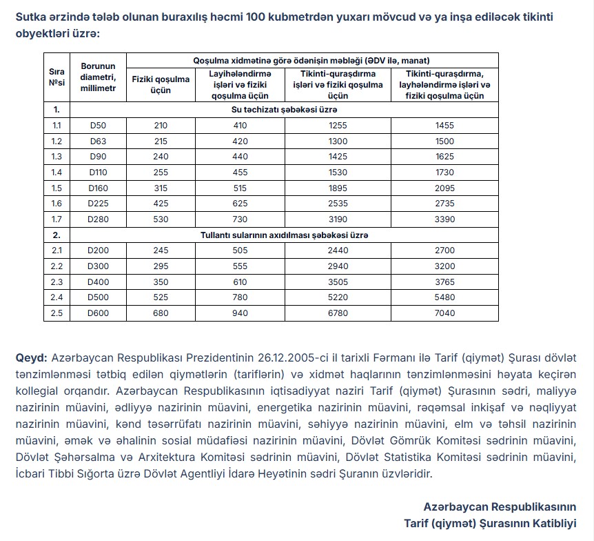 Sutka ərzində tələb olunan buraxılış həcmi 100 kubmetrə qədər olan tikinti obyektləri üçün su təchizatı şəbəkəsinə qoşulmanın birdəfəlik tarifi borunun diametrinden asılı olaraq 995 manat və ya 1015 manat, tullantı sularının axıdılması şəbəkəsinə qoşulmaya görə 1635 manat məbləğində müəyyən edilib.Tarif (qiymət) Şurasının iclasında Azərbaycan Dövlət Su Ehtiyatları Agentliyinin təklifi nəzərə alınaraq iclasda su təchizatı və tullantı sularının axıdılması sistemlərinə qoşulma xidmətinə görə ilk dəfə olaraq tariflər təsdiq edilib. İndiyədək bu sahədə işlər dövlət tənzimlənməsi olmadan pərakəndə şəkildə fərqli məbləğlərlə həyata keçirilirdi.