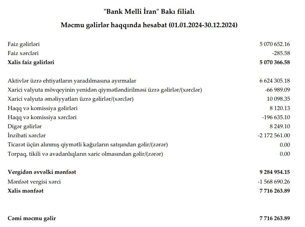 "Bank Melli İran" Bakı filialı 2024-cü ili 7 milyon 716 min manat xalis mənfəət ilə başa vurub. Filial 2023-cü ili 3 milyon 871 min manat xalis mənfəət ilə bağlamışdı. Beləliklə, 2023-cü illə müqayisədə 2024-cü ildə "Bank Melli İran" Bakı filialının xalis mənfəəti 3 milyon 845 min manat və ya 2 dəfə (100%-ə yaxın) artıb.