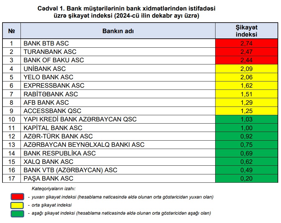 Marja.az xəbər verir ki, yuxarı şikayət indeksində (qırmızı zona) 3 bank, orta şikayət indeksində (sarı zona) 6 bank, aşağı şikayət indeksində (yaşıl zona) 8 bank yer alıb. İndeksdə 17 bank göstərilib.