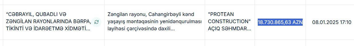Marja xəbər verir ki, qalib şirkət "Protean Construction" ASC-dir. Onun təklifinin qiyməti 18 milyon 731 min manatdır.