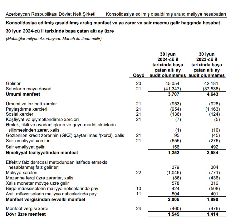 Azərbaycan Respublikası Dövlət Neft Şirkəti (SOCAR) 2024-cü ilin ilk 6 ayını (yanvar-iyun) 1 milyard 545 milyon manat xalis mənfəət ilə başa vurub. Şirkət 2023-cü ilin eyni dövrünü 1 milyard 414 milyon manat xalis mənfəət ilə bağlamışdı.