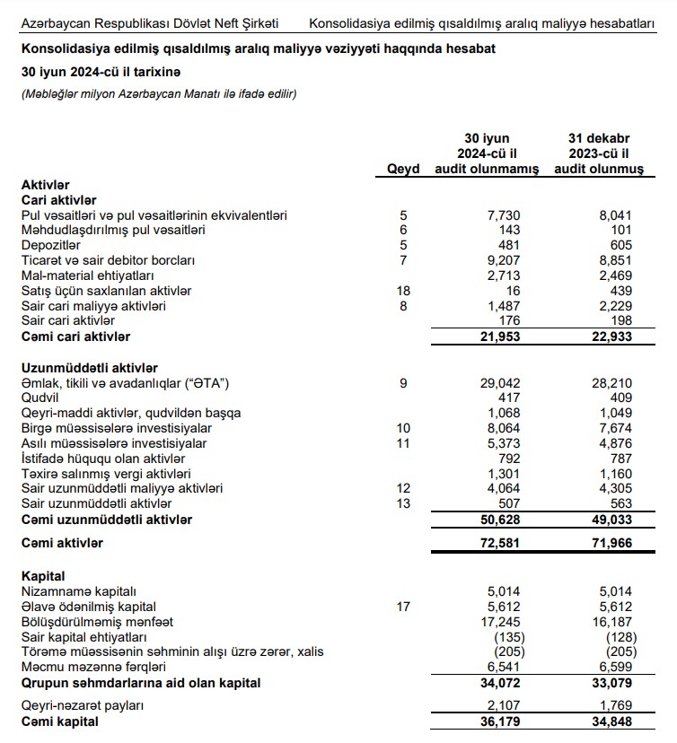 30 İyun 2024-cü il tarixində SOCAR 72 milyard 581 milyon manat cəmi aktivlərə malik olub. Şirkət 2023-cü ilin sonunda 71 milyard 966 milyon manat cəmi aktivlərə malik idi.