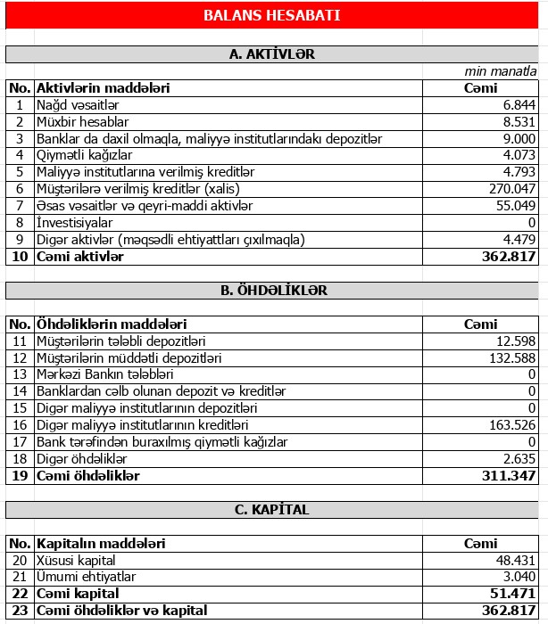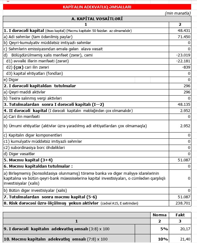 2024-cü ilin 4-cü rübün sonuna Bankın məcmu kapitalı 51,1 milyon manat təşkil edib, bu da Mərkəzi Bankın minimum tələbindən (50 milyon manat) yüksəkdir. Məcmu kapitalın adekvatlıq göstəricisi 21.4% təşkil etməklə, Mərkəzi Bankın minimum tələbini (10%) əhəmiyyətli dərəcədə üstələyir.