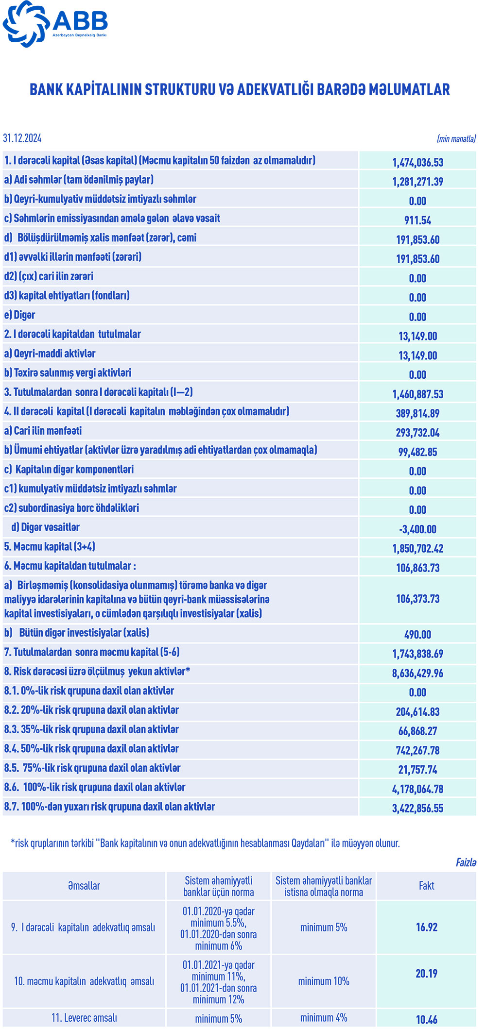 31 dekabr 2024-cü il tarixində ABB 1 milyard 743 milyon 760 min manat məcmu kapitala malik olub. İlin sonuna ABB-nin I dərəcəli kapitalının adekvatlıq əmsalı 16.92%, məcmu kapitalının adekvatlıq əmsalı 20.19% təşkil edib. Beləliklə, Bankın kapital adekvatlığı göstəriciləri tənzimləyici orqanın müəyyən etdiyi normalardan (müvafiq olaraq sistem əhəmiyyətli banklar üçün 6% və 12%) yüksək qalmaqdadır.