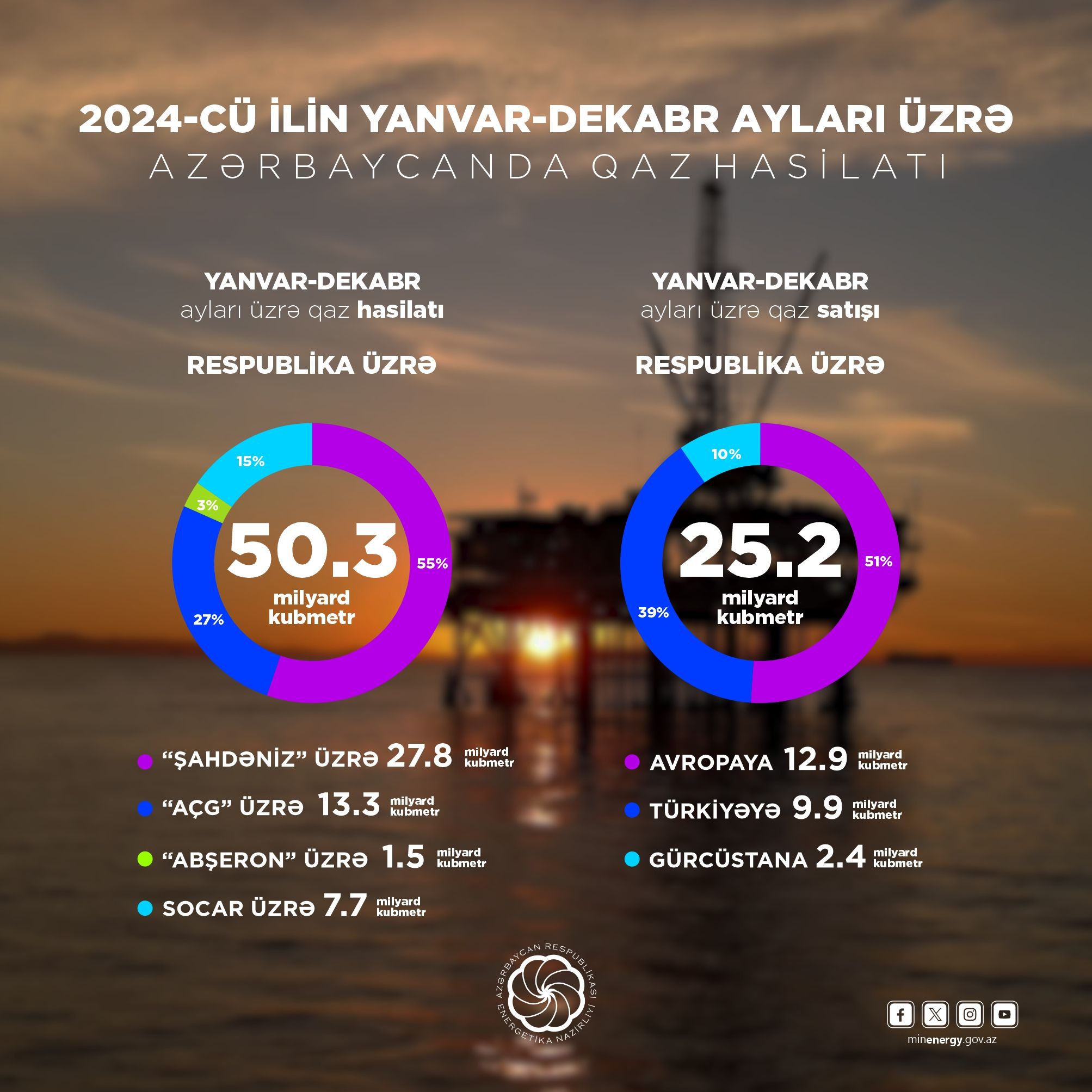 2024-cü ildə respublikada 50,3 milyard kubmetr təbii qaz hasil edilib. Qazın 13,3 milyard kubmetri “Azəri-Çıraq-Günəşli”, 27,8 milyard kubmetri “Şahdəniz”, 1,5 milyard kubmetri “Abşeron” yatağı, 7,7 milyard kubmetri isə SOCAR üzrə hasil olunub. 2023-cü ilin müvafiq dövrünə nisbətən 2 milyard kubmetr artımla qaz hasil edilib.