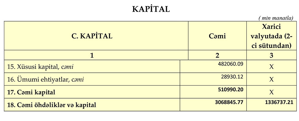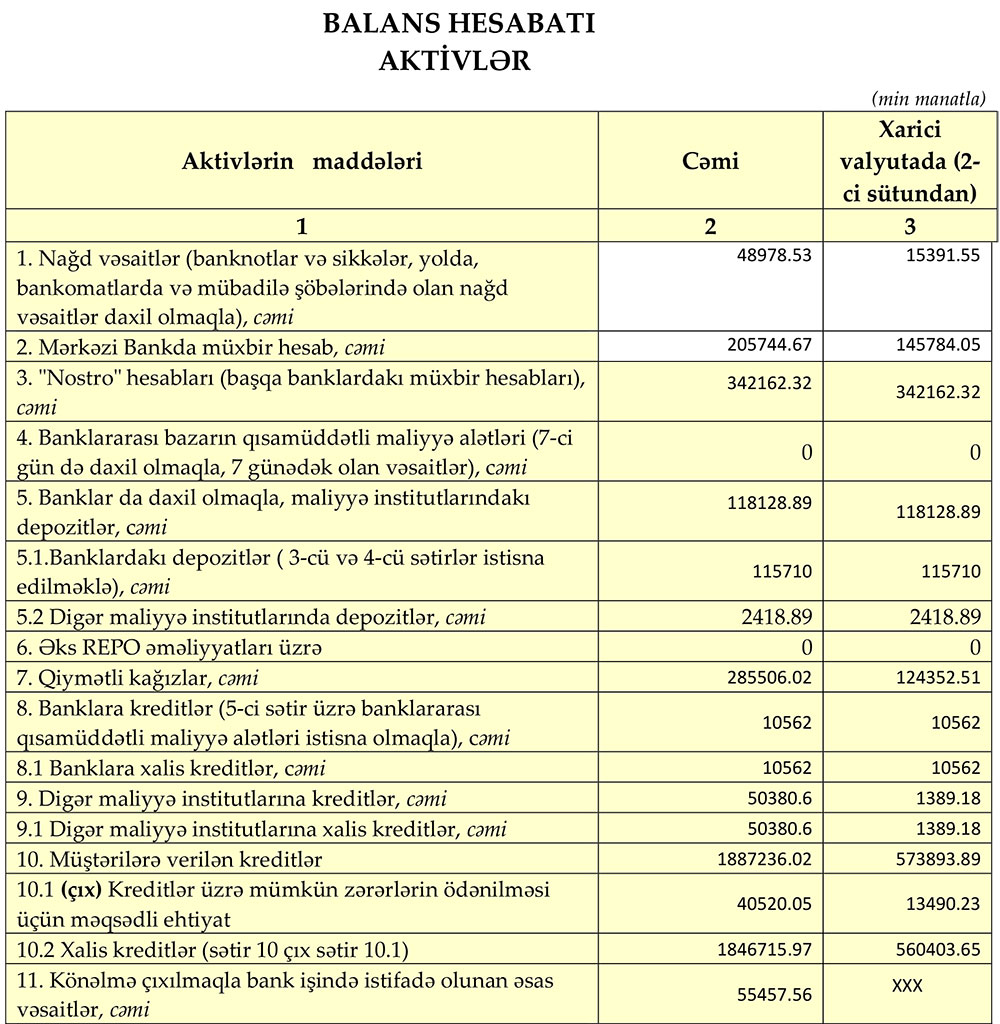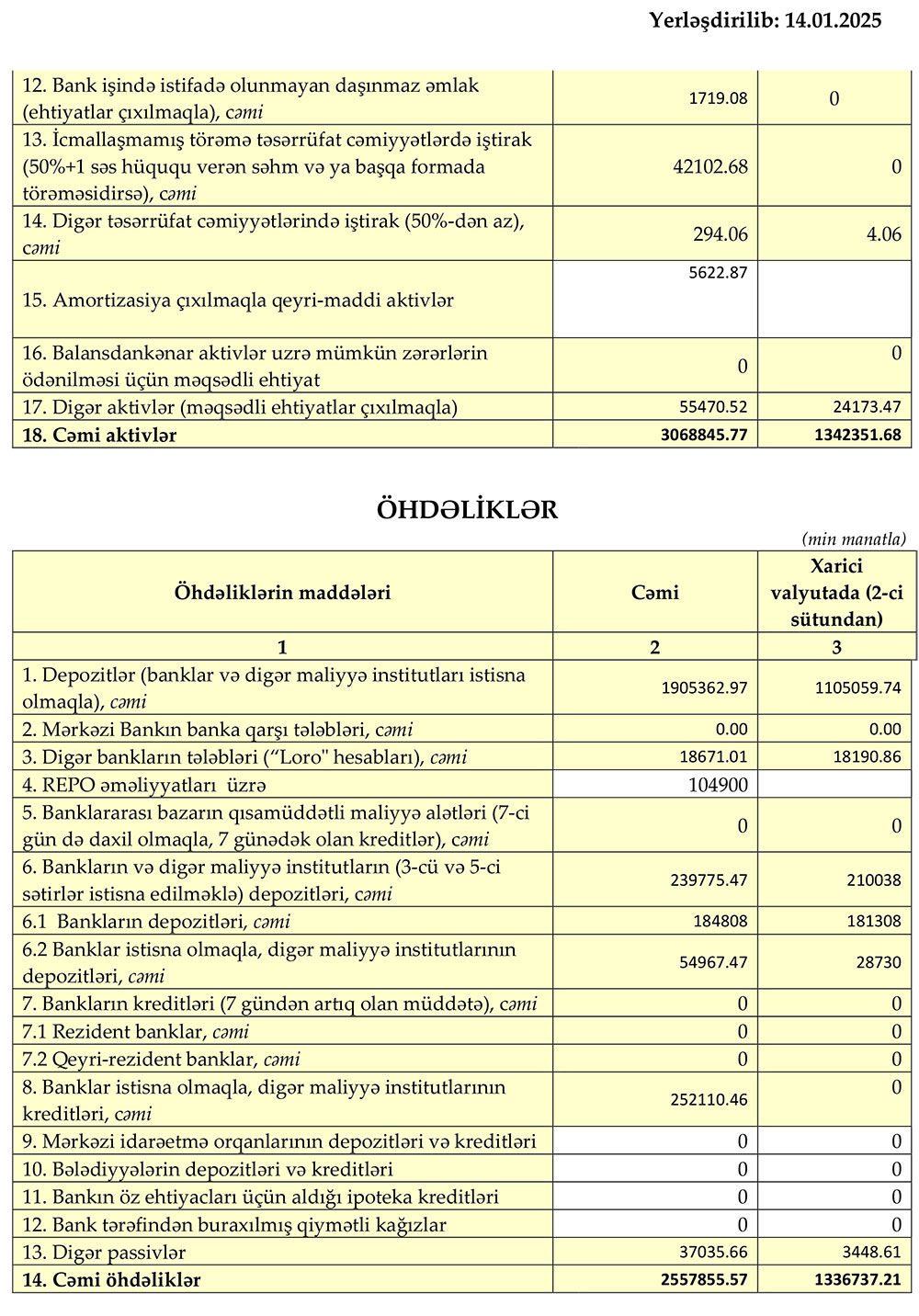 Qeyd edilib ki, 2024-cü il ərzində əsas maliyyə göstəricilərində stabil mövqe nümayiş etdirən Bankın aktivlərinin həcmi ötən ilin sonu ilə müqayisədə stabil qalaraq hesabat dövrünün sonuna 3 milyard 68 milyon manat təşkil etmişdir.