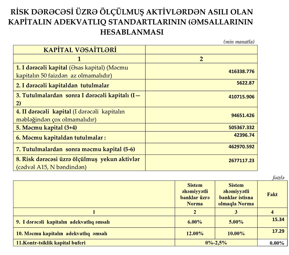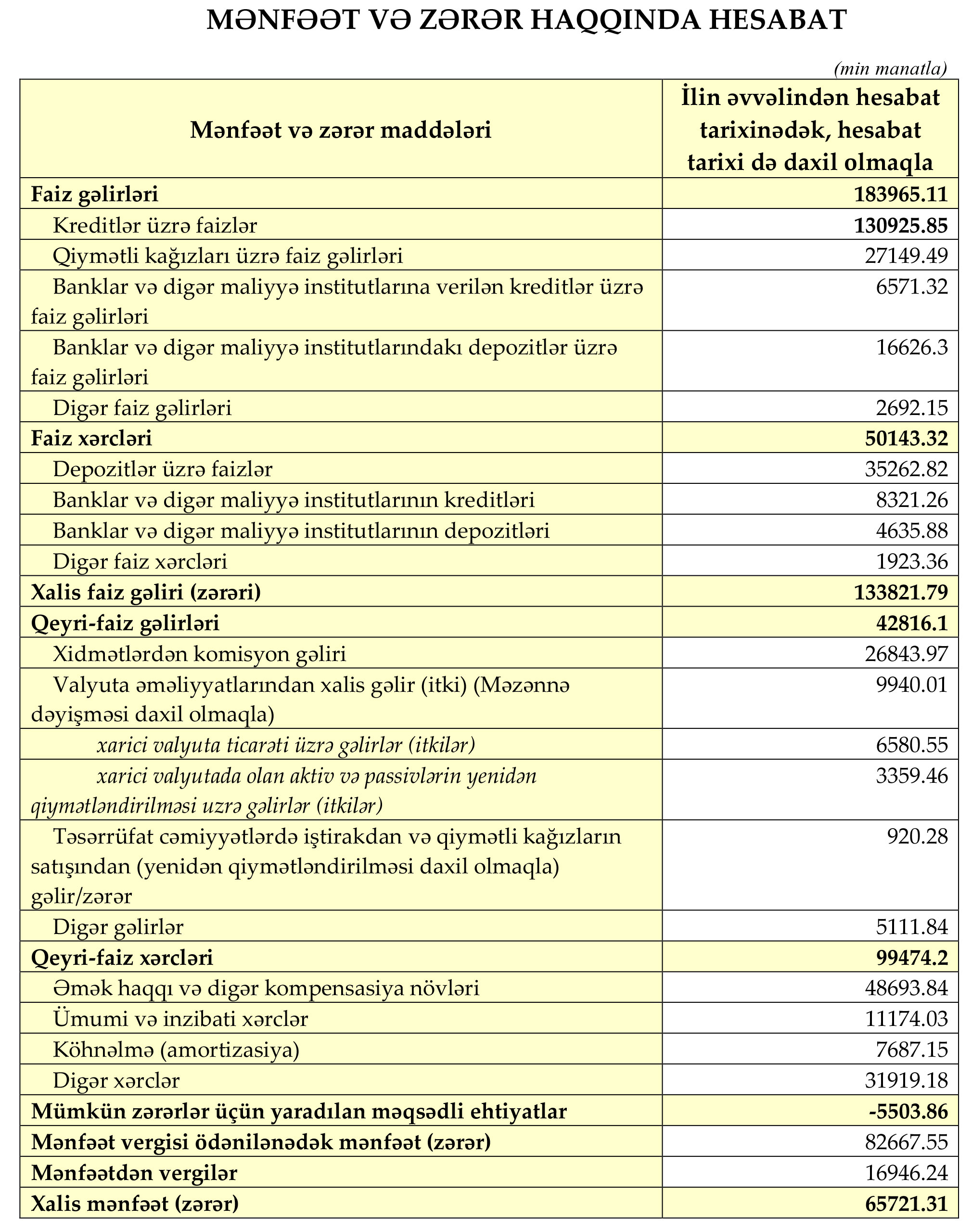 Kredit portfelinin həcmi (digər maliyyə institutları daxil) artaraq 1 milyard 937 milyon 620 min manat, banklar və digər maliyyə institutları istisna olmaqla depozitlərin həcmi 1 milyard 905 milyon 360 min manat təşkil etmiş, Bankın cəmi kapitalı 511 milyon manata çatmışdır.
