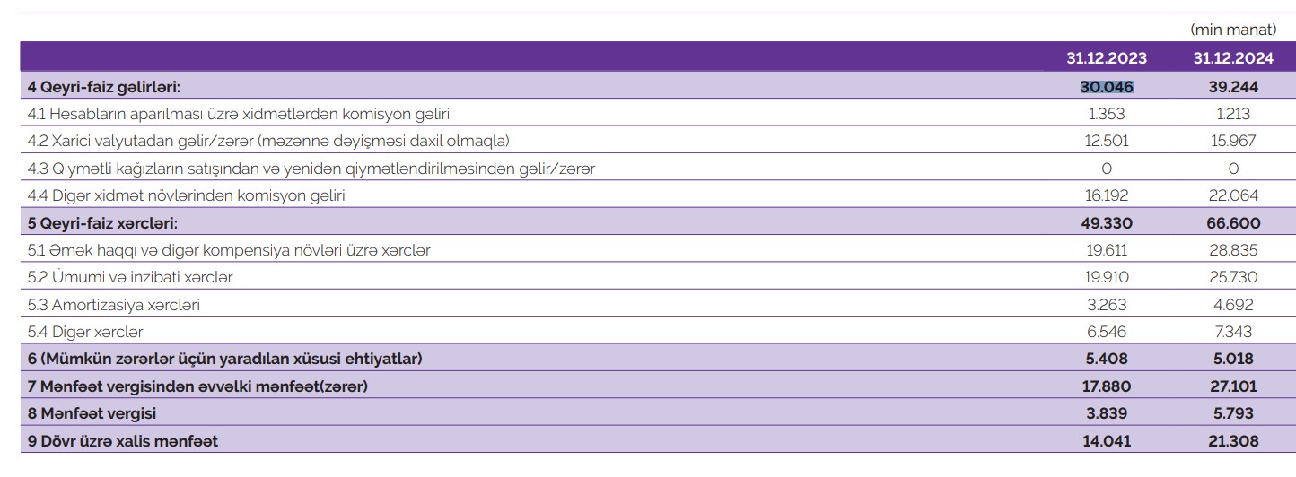 Marja Bankın rüblük hesabatlarına istinadən xəbər verir ki, "Azər-Türk Bank" cəmi əməliyyat gəlirləri (faiz və qeyri-faiz gəlirləri) 2023-cü ildə 92 milyon 563 min manat ikən, 2024-cü ildə 146 milyon 465 min manat təşkil edib (53 milyon 902 min manat və ya 58,2% artıb).