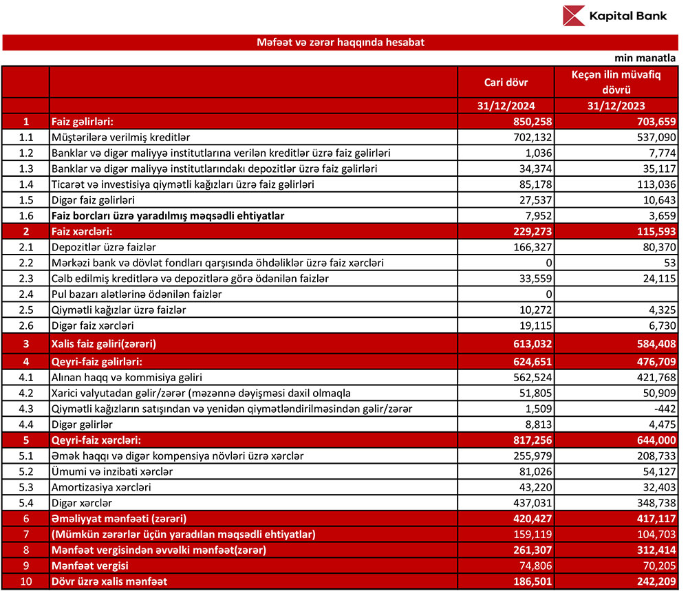 "Kapital Bank" ASC 2024-cü ili 186 milyon 501 min manat xalis mənfəət ilə başa vurub. Bank 2023-cü ili 242 milyon 209 min manat xalis mənfəət ilə bağlamışdı. Beləliklə, ötən il "Kapital Bank"ın xalis mənfəəti 55 milyon 708 min manat və ya 23% azalıb. Xalis mənfəətin düşməsi ötən il mümkün zərərlər üçün yaradılan məqsədli ehtiyatlara daha böyük məbləğdə vəsait ayrılması ilə əlaqədardır.