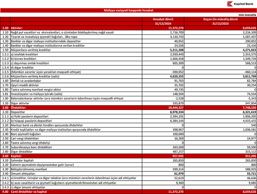 2024-cü ildə "Kapital Bank"ın cəmi depozit portfeli 2 milyard 656 milyon 715 min manat və ya 42% artaraq 31 dekabr 2024-cü il tarixində 8 milyard 978 milyon 334 min manata çatıb.