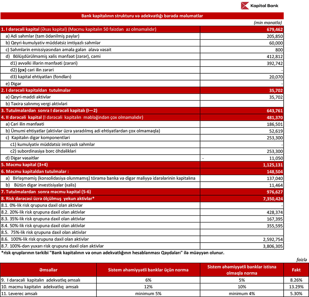 31 dekabr 2024-cü il tarixində "Kapital Bank" ASC 976 milyon 627 min manat məcmu kapitala yaxın olub. Bank 2023-cü ilin sonunda 833 milyon 95 min manat məcmu kapitala malik idi.