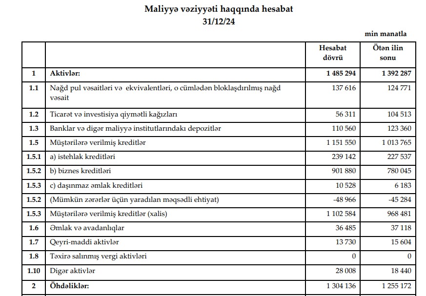 Keçən il "AccessBank"ın cəmi aktivləri 93 milyon 7 min manat və ya 6,7% artaraq 31 dekabr 2024-cü il tarixində 1 milyard 485 milyon 294 min manat təşkil edib. Bank 2023-cü ilin sonunda 1 milyard 392 milyon 287 min manat cəmi aktivlərə malik idi.