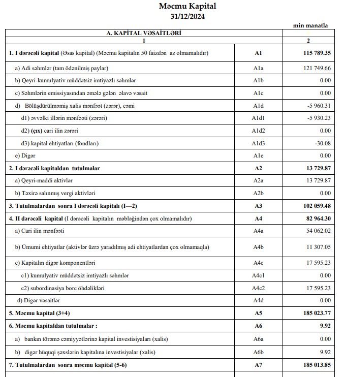 31 dekabr 2024-cü il tarixində "AccessBank" QSC 185 milyon 16 min manat məcmu kapitala malik olub. Bank 2023-cü ilin sonunda 143,5 milyon manat məcmu kapitala malik idi.
