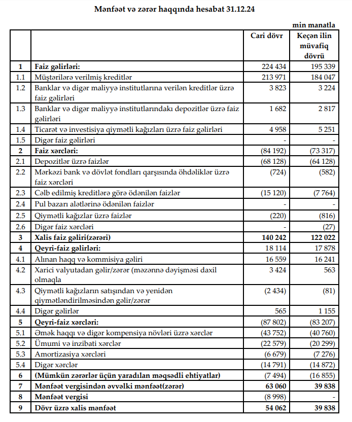Müqayisə üçün qeyd edək ki, 2023-cü ildə "AccessBank"ın cəmi əməliyyat gəlirləri 213 milyon 217 min manat, cəmi əməliyyat xərcləri 156 milyon 524 min manat, gəlirlər xərcləri üstələdiyindən əməliyyat mənfəəti 56 milyon 693 min manat təşkil etmişdi.