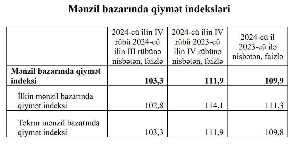 2024-cü ildə Azərbayanın mənzil bazarında qiymət indeksi 2023-cü illə müqayisədə 9,5 faiz artıb.