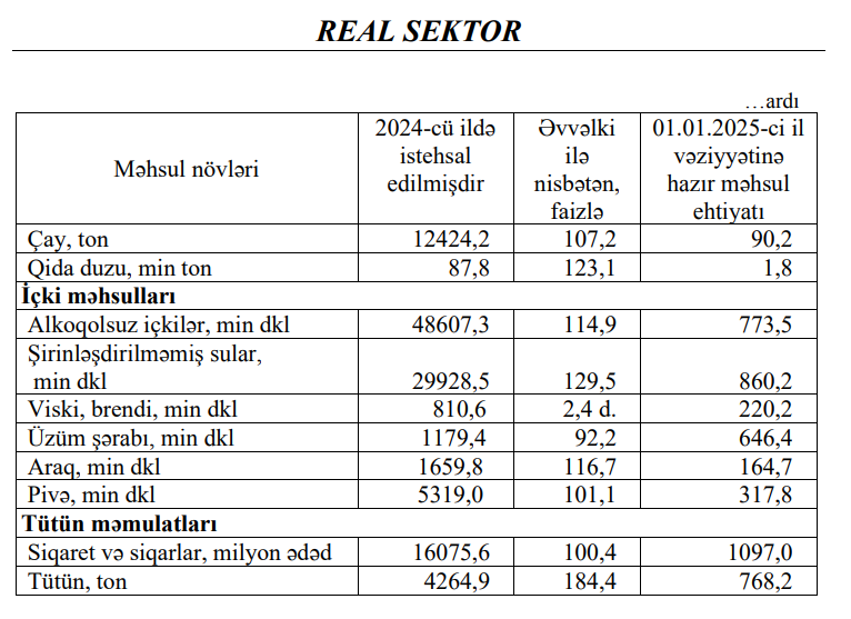 2024-cü illə müqayisədə 2024-cü ildə Azərbaycanda içki istehsalında 15,7 faiz, qida məhsullarının istehsalında 10,5 faiz, tütün məmulatlarının istehsalında isə 4,1 faiz artım müşahidə olunmuşdur.