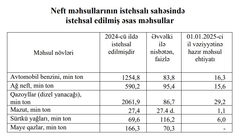 Qeyd edilib ki, neft məhsullarından sürtkü yağları istehsalı 16,2 faiz artmış, ağ neft istehsalı 4,6 faiz, neft bitumu istehsalı 4,6 faiz, avtomobil benzini istehsalı 16,2 faiz, neft koksu istehsalı isə 23,5 faiz azalmışdır.