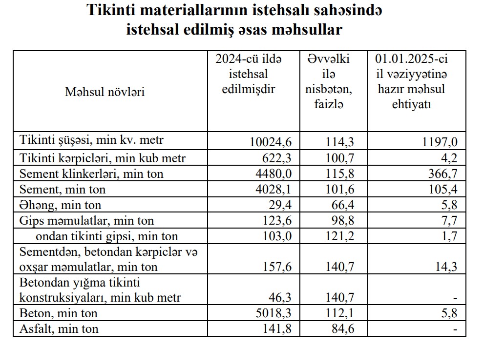 Tikinti materiallarının istehsalı sahəsində 2024-сü ildə istehsalın ümumi dəyəri 1 milyard 423,3 milyon manat olmaqla, əvvəlki illə müqayisədə 16,9 faiz artmışdır. Dövr ərzində sementdən, betondan kərpiclər və oxşar məmulatların istehsalı 40,7 faiz, betondan yığma tikinti konstruksiyalarının istehsalı 40,7 faiz, tikinti gipsi istehsalı 21,2 faiz, sement klinkerləri istehsalı 15,8 faiz, beton istehsalı 12,1 faiz artmış, asfalt istehsalı isə 15,4 faiz azalmışdır.