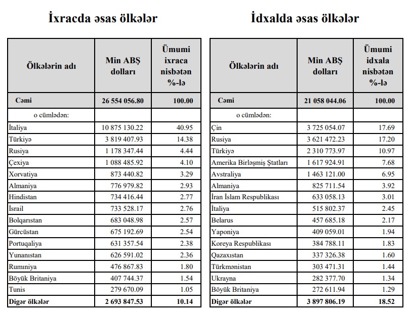 Azərbaycanın ən çox mal aldığı və satdığı ölkələr - SİYAHI