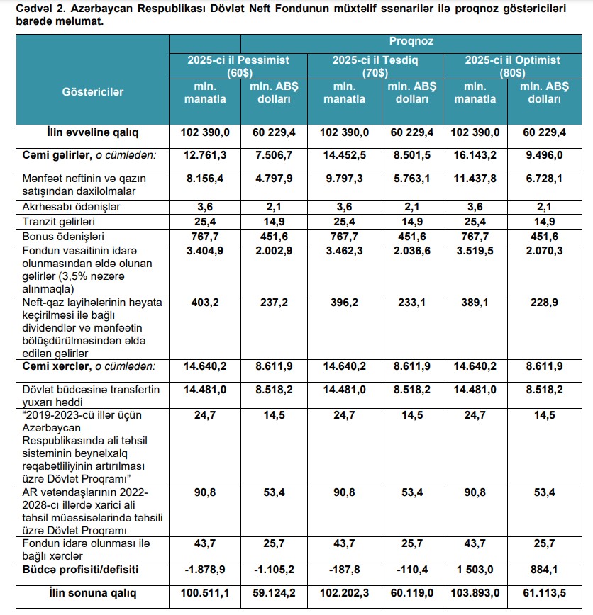 2025-ci il üçün Fondun büdcəsinin baza göstəricisi olan 1 barel neftin orta illik ixrac qiyməti 70,0 ABŞ dolları məbləğində, qazın qiymətinin isə cari illə müqayisədə az proqnozlaşdırlması fonunda Fondunun növbəti il üçün gəlirləri cari ilin dürüstləşdirilmiş proqnozlaşdırılan gəlirlərindən təqribən 2,4% çox, gözlənilən icra göstəricilərindən isə 8,4 % az nəzərdə tutulmuşdur.
