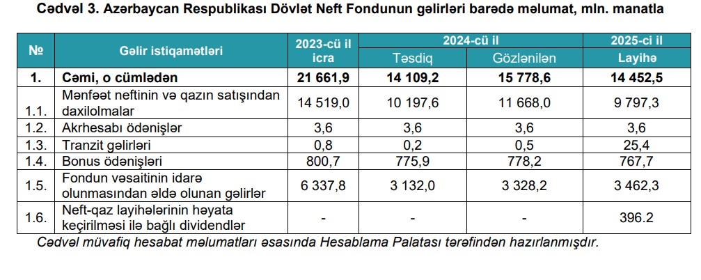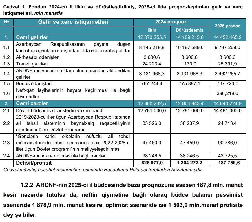 Qeyd edilib ki, cari il üçün ilkin təsdiq edilmiş Fondun büdcəsi ilə müqayisədə xam neftin satış qiymətinin 10,0 ABŞ dolları artıq nəzərdə tutulmasına, ilk dəfə olaraq Fondun gəlirlər hissəsinə yeni gəlir mənbəsinin əlavə edilməsinə (neft-qaz layihələrinin həyata keçirilməsilə bağlı dvidendlər 396,2 mln. manat) baxmayaraq Azəri-Çıraq-Günəşli yatağı üzrə hasilatın həcminin azalması və Şahdəniz yatağı üzrə qaz hasilatının təxminən eyni, qiymətinin isə az olması, transfert həcminin isə maksimum həddində nəzərdə tutulması, Fondun büdcəsinin kəsirlə (-187,8 mln manat) formalaşmasının proqnozlaşmasına şərait yaratmışdır. Azərbaycan Respublikası Dövlət Neft Fondunun 2024-cü il ilkin və dürüstləşdirilmiş, 2025-ci il büdcəsi aşağıdakı gəlir və xərc istiqamətləri üzrə formalaşmışdır