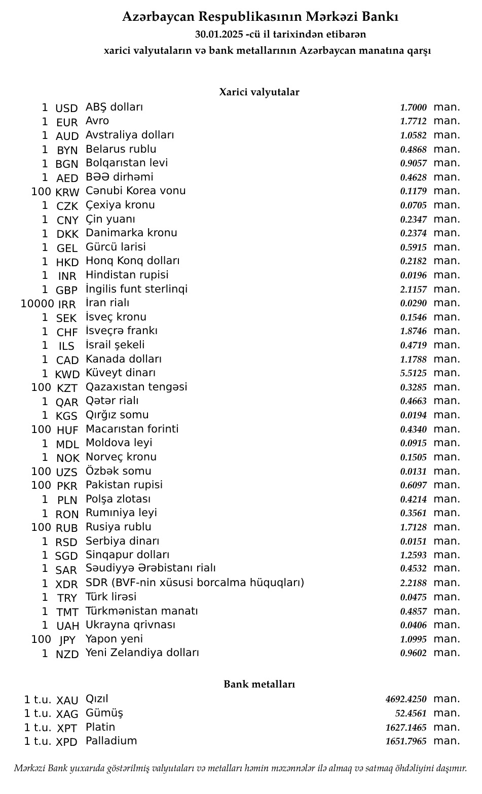 Rəsmi məzənnələr açıqlandı