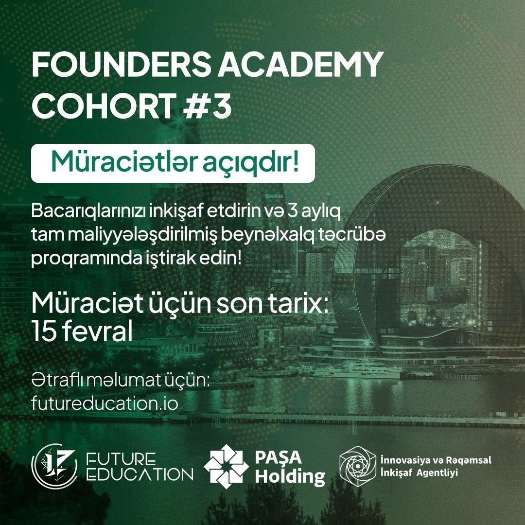 Proqram PAŞA Holding-in dəstəyi ilə həyata keçirilir.(®) PAŞA Holding-in dəstəyi, İnnovasiya və Rəqəmsal İnkişaf Agentliyinin təşəbbüsü və Future Education-un təşkilatçılığı ilə "Founders Academy" proqramının 3-cü dalğası başlayır.