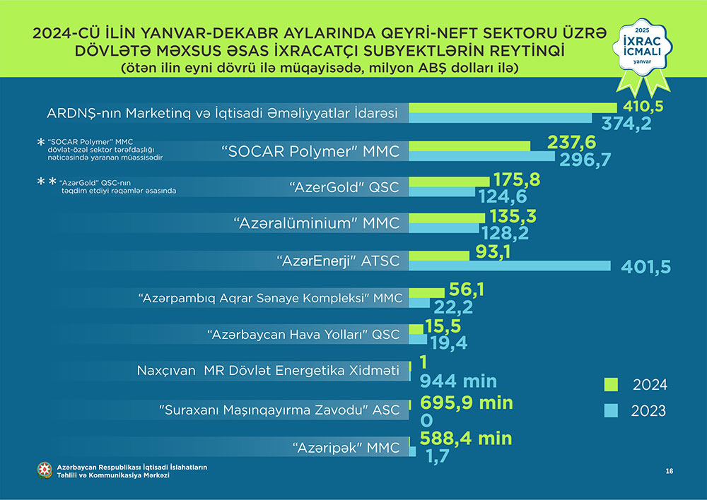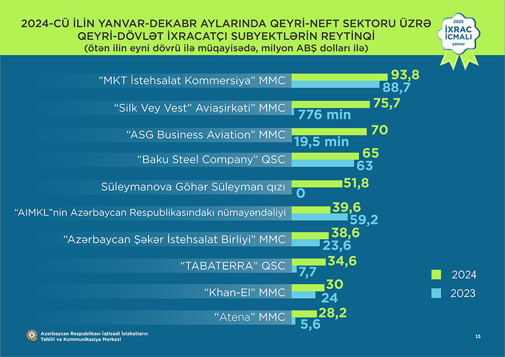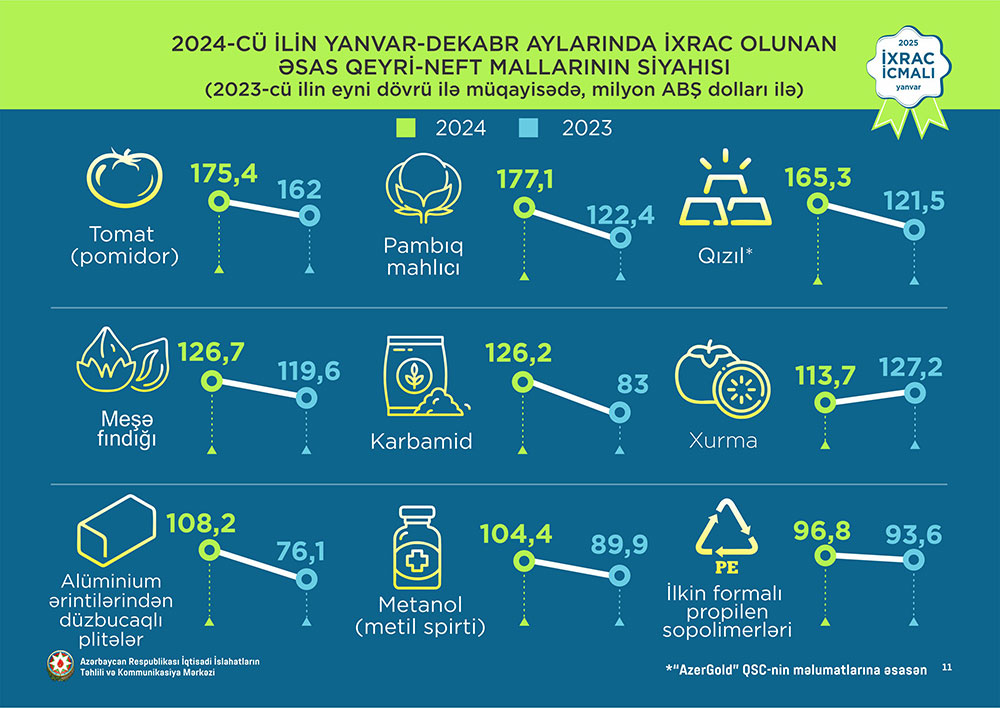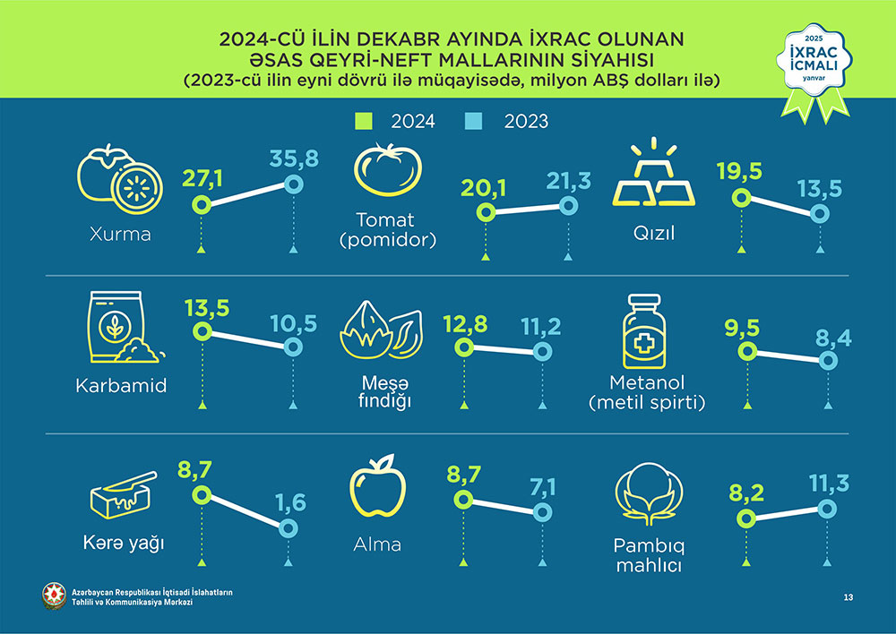 2024-cü ilin dekabr ayında ixrac edilmiş qeyri-neft sektoruna aid malların siyahısında xurma (27,1 milyon ABŞ dolları) birinci, tomat (pomidor) (20,1 milyon ABŞ dolları) ikinci, qızıl (19,5 milyon ABŞ dolları) üçüncü olub.