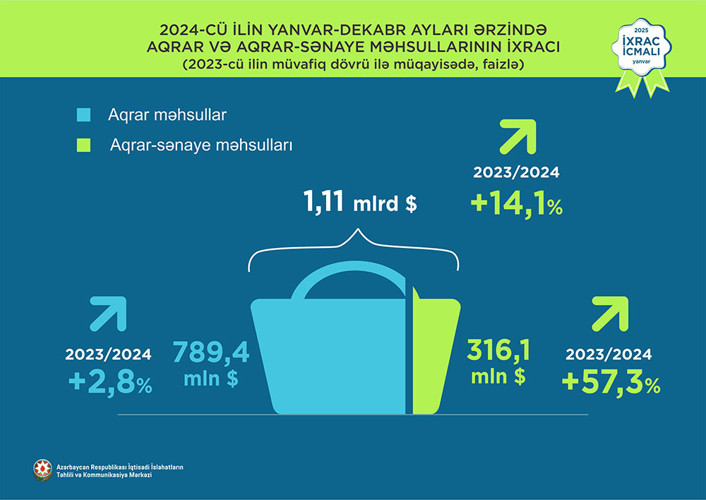 Ötən ilin yanvar-dekabr ayları ərzində aqrar məhsulların ixracı 2,8% artaraq 789,4 milyon ABŞ dolları, aqrar-sənaye məhsullarının ixracı 57,3% artaraq 316,1 milyon ABŞ dollarına bərabər olub. Bütövlükdə aqrar və aqrar-sənaye məhsullarının birgə ixracı 14,1% artaraq 1,11 milyard ABŞ dolları təşkil edib.