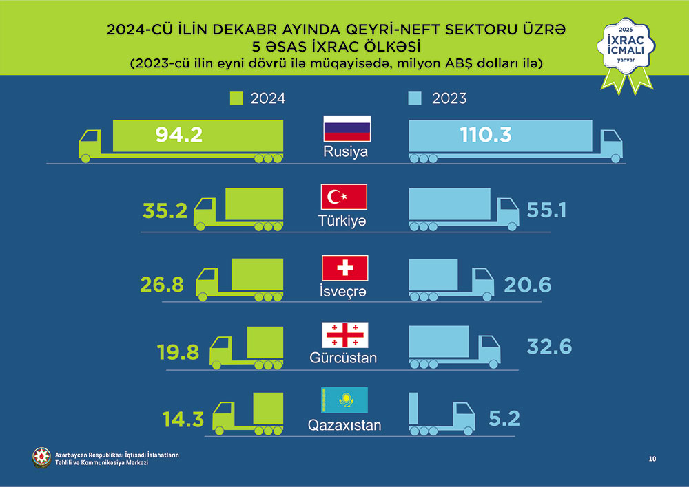 Ötən ilin dekabr ayında qeyri-neft sektoruna aid ən çox mal ixrac edilən ölkələrin siyahısında Rusiya Federasiyası (94.2 milyon ABŞ dolları) birinciliyə yüksəlib. Bu siyahıda Türkiyə (35.2 milyon ABŞ dolları) ikinci, İsveçrə (26.8 milyon ABŞ dolları) üçüncü olub.
