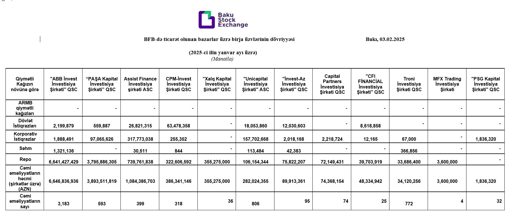 2025-ci ilin yanvar ayı üzrə Bakı Fond Birjasında (BFB) ticarət olunan bazarlar üzrə birja üzvlərinin (investisiya şirkətlərinin) dövriyyələri açıqlanıb.
