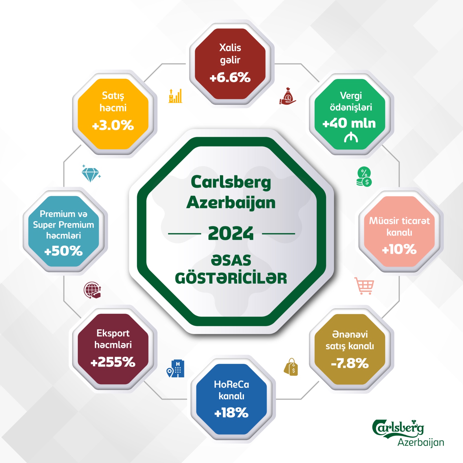 Şirkət 2023-cü illə müqayisədə satış həcmini 3.0% artıraraq, daha əlverişli məhsul çeşidi sayəsində xalis gəlirini 6.6% artırıb. "Carlsberg Azerbaijan"ın 2024-cü ildə pivə ixracı 2023-cü il ilə müqayisədə 255% artıb."Carlsberg Azerbaijan", ölkənin pivə istehsalı sahəsinin lideri, 2024-cü ildə əsas göstəricilər üzrə yüksək nəticələr nümayiş etdirib, o cümlədən 40 milyon manatdan çox rekord vergi ödənişləri həyata keçirib.