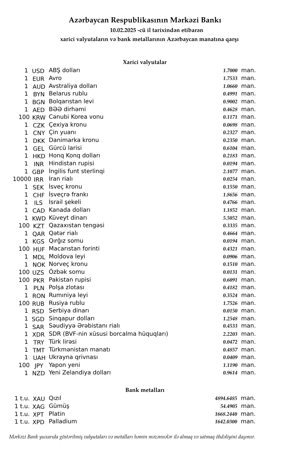 Rəsmi məzənnələr açıqlandı